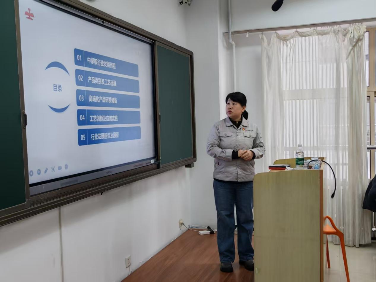 把产线搬进教室,让钢板成为教材—鞍钢股份鲅鱼圈厚板部首席工程师李新玲走进课堂。11月27日下午,辽宁科技大学材料与冶金学院《金属学及热处理》校企共建模块在明德楼C216正式开讲。李新玲应邀担任校企共建课程企业老师,以《中厚板行业发展与关键技术创新应用》为题,为冶金工程专业2023级3班本科生带来一场“热气腾腾”的产业公开课。