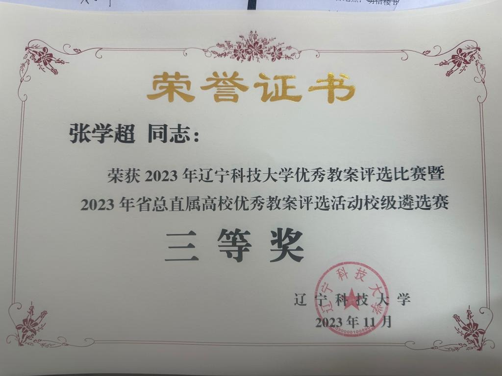 荣获2023年辽宁科技大学优秀教案评选比赛暨2023年总共直属高校优秀教案评选活动校级遴选赛