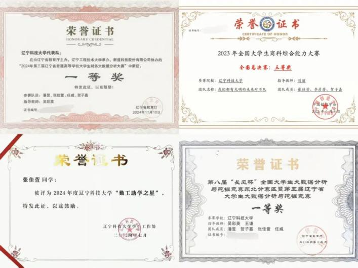 在科研与竞赛领域,张佳萱始终秉持“经世致用”的核心追求,将理论知识转化为实践能力。科研方面,她聚焦财务领域实际问题,以严谨细致的治学态度开展研究,从选题调研到论文撰写全程精益求精,最终以第一作者身份发表省级期刊论文1篇、国家级期刊论文1篇,牵头负责校级大创项目1项,带领团队查阅文献、开展线上调研,反复验证研究假设、攻克技术难点,顺利完成项目研究,实现了从理论到实践的有效跨越。竞赛方面,她与团队伙伴共同努力,备战各项赛事,聚焦财务专业核心能力,结合大数据分析等前沿技能,打磨参赛作品,凭借扎实的专业知识和高效的团队协作,斩获全国大学生商科综合能力大赛三等奖、辽宁省大学生大数据分析与挖掘竞赛一等奖、辽宁省财务大数据分析大赛一等奖等多项佳绩,在竞技中锤炼本领,在实践中深化学以致用校训精神。