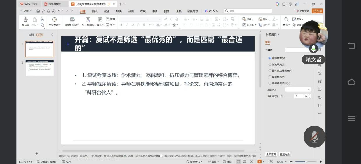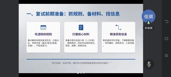 赖文哲老师从导师视角解读复试本质,指出复试核心是匹配适配的科研合伙人,重点考查学术潜力、逻辑思维等综合素养,更青睐善协作、能攻坚、沟通佳的考生。他建议学子打磨一项突出技能提升竞争力,传授压力面试应对技巧,强调面对提问要秉持不卑不亢、正视不足、展现改进的原则,还为备考学子开放答疑通道,提供全程指导支持。