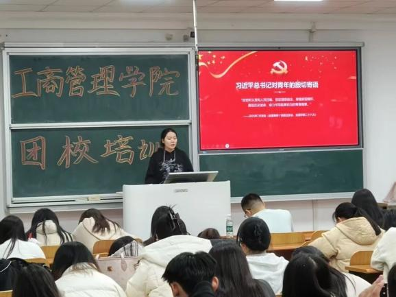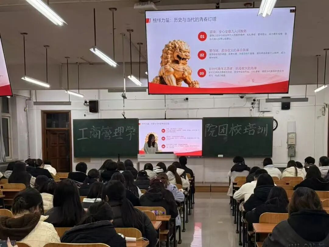 理论培训环节,多位优秀学生骨干将理论阐释与青春视角深度融合,为理论学习注入了蓬勃朝气,让红色思想入脑入心。工商管理学院分团委副书记郑旭婷围绕“学团史强信念,做新时代合格共青团员”,系统讲解了共青团从成立之初至今的发展脉络,明确了团员在思想觉悟、责任担当等方面的要求,引导学子找准团员身份定位;学生会主席颜钰金以“回望历史,革命岁月中年岁相仿的我们”为题,通过讲述革命年代青年英烈的奋斗故事,以时空对话的独特视角,让学子直观感受“同龄人”的家国情怀与使命担当;团务办公室负责人刘雨竹以“强国之梦 青年担当”为题,从爱国主义的历史传承切入,结合新时代国家发展需求,深刻阐释了青年与强国建设的紧密联系,激发学子的责任意识;主席团成员宁可以“青年与时代同行,红色精神永流传”为核心展开讲解,通过剖析红色精神的核心内涵与时代价值,揭示了红色精神传承与团员使命担当的内在关联,引导学子将红色基因融入青春血脉;志愿服务部负责人刘秋实以“传承红色基因,争做有理想的新时代团员”为核心,结合志愿公益实践案例,讲解了如何在服务他人、奉献社会中践行红色精神,让理想信念落地生根;文化活动部负责人张佳慧以“学习新思想,争做时代好青年”为核心,以“有理想、敢担当、能吃苦、肯奋斗”为成长坐标,结合青年成长实际,为学子指明了新时代青年的成长路径与奋斗方向。