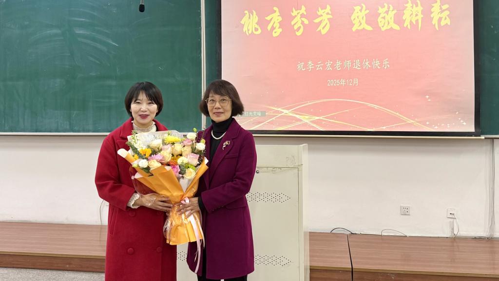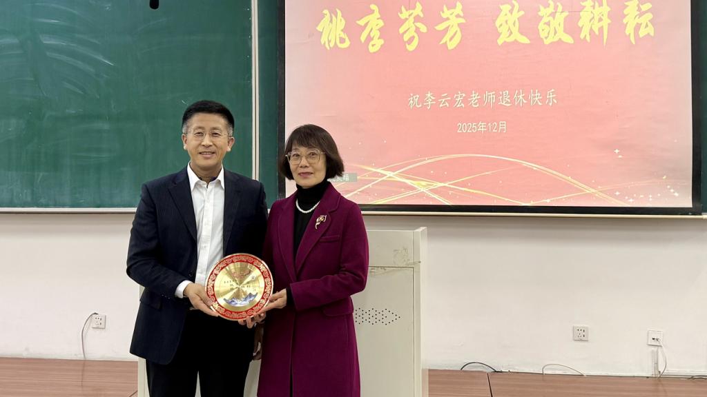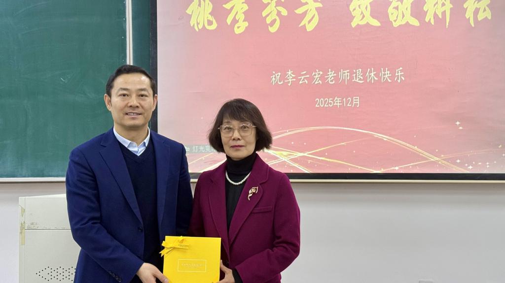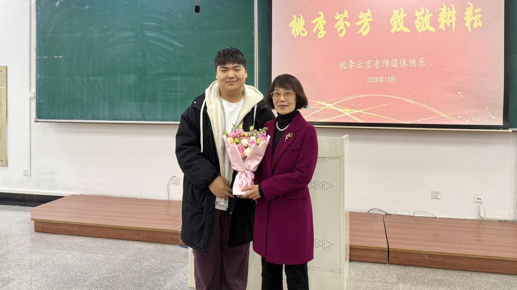 2025年12月19日上午,工商管理学院以“最后一堂课+荣休欢送会”的特殊形式,在明德楼D308教室为深耕教坛数十载的李云宏老师举办温情庄重的荣休仪式。学院党委副书记、纪委书记汪若水主持活动,院党委书记田树学、院长金玉然、副院长张晓旭及教师代表、学生代表共同参会。
