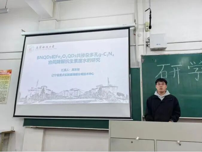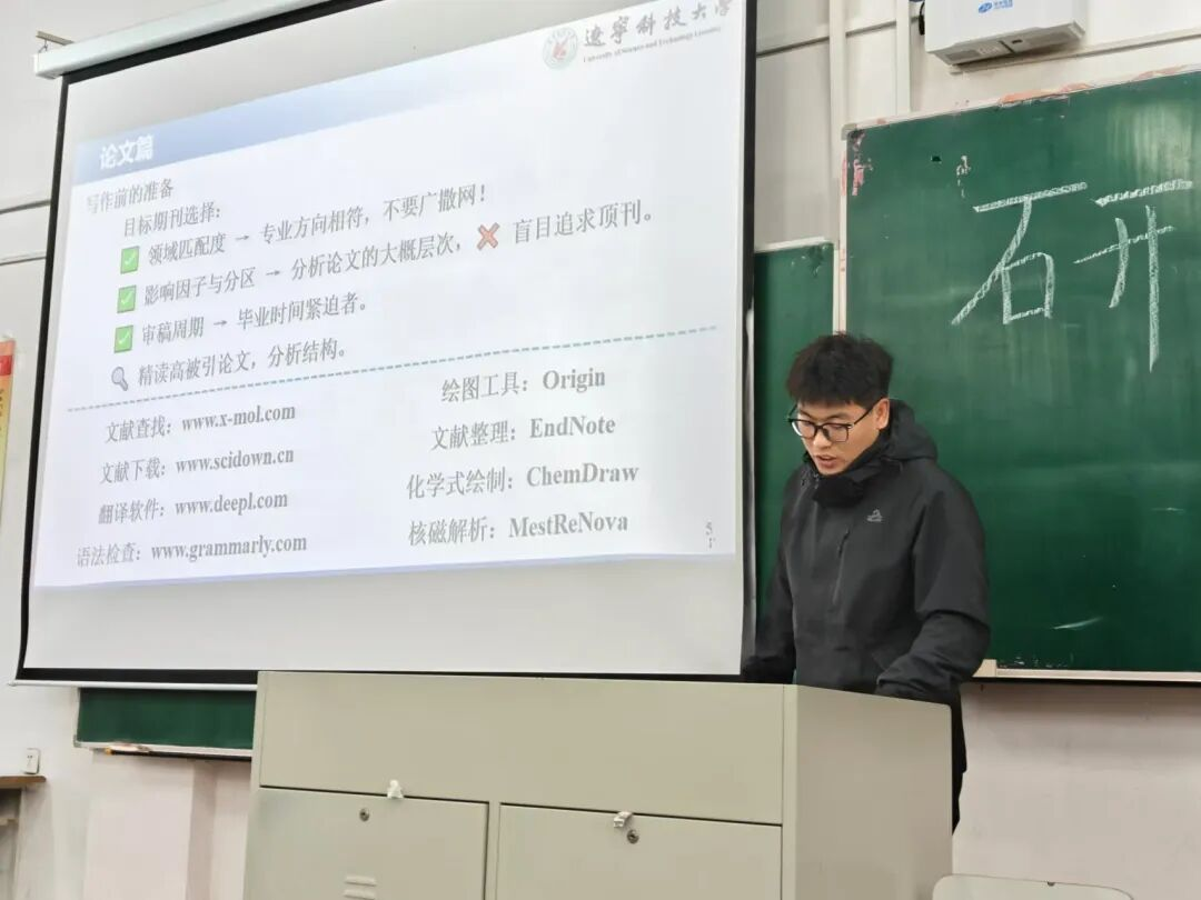 首先,博士生2024级班长陈东同学,从实验室生存守则宝典,详细讲解实验安全、数据处理、操作手法等要点,同时分享文献工具使用方法和论文写作经验等,为研一的同学们在实验安全、科研数据提取及论文写作等提供非常实用的操作指导;2024级博士高东旭同学围绕“BNQDsFe₂O₃QDs共掺杂多孔g - C₃N₄ 协同降解抗生素废水的研究进行学术科研成果的分享,本课题依托辽宁省重点实验室的学术平台,从课题研究背景、实验方法到抗生素废水处理曾等,从能源环保的理念植入课题分析,让同学们认识减碳、降费、环保的学术价值;2022级班长陈壹刘同学聚焦科研大赛赛道,他三年时间参与20余项大赛成果经历,和大赛的赛道选择、目标确定、课题方法、比赛细节及答辩技巧等内容做详细解读,他强调研究生一定在各类全国科研竞赛中,要有针对性强化科研学术实践能力与创新思维的锻炼,鼓励学弟学妹们要积极参与,不断提升科研竞争力和科研水平,努力成为科技创新的第一道美食主菜的大厨和创作者;2023级研究生会成员朱琳同学,以如何做一个靠谱的研究生为主题,结合自身经历,从师生关系处理、时间管理、心态调整等方面给出建议,分享作为国奖获得者,如何在学习和工作中自我消化压力,积极心态面对科研生活中的挑战,让同学们受益匪浅。