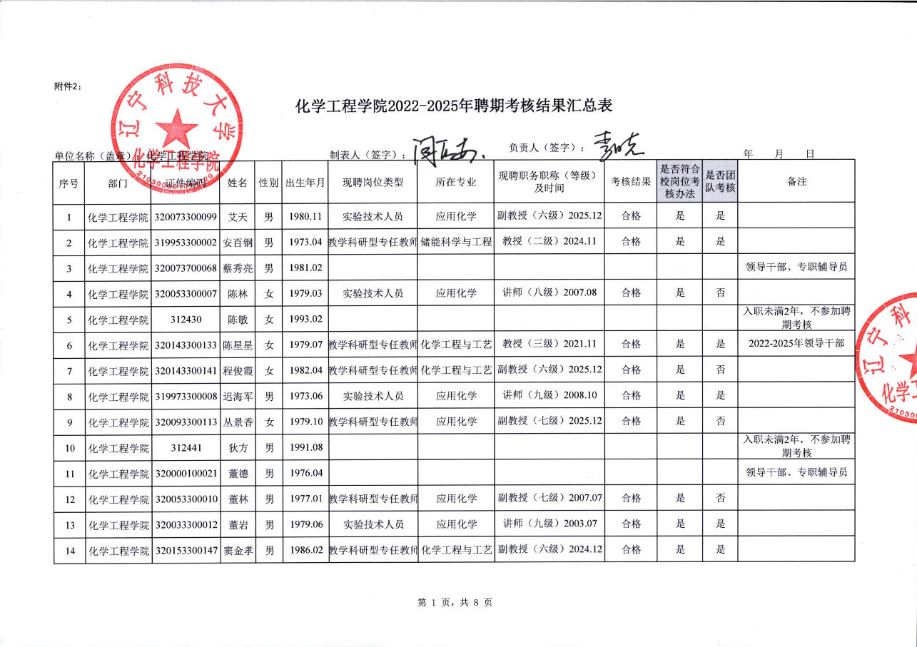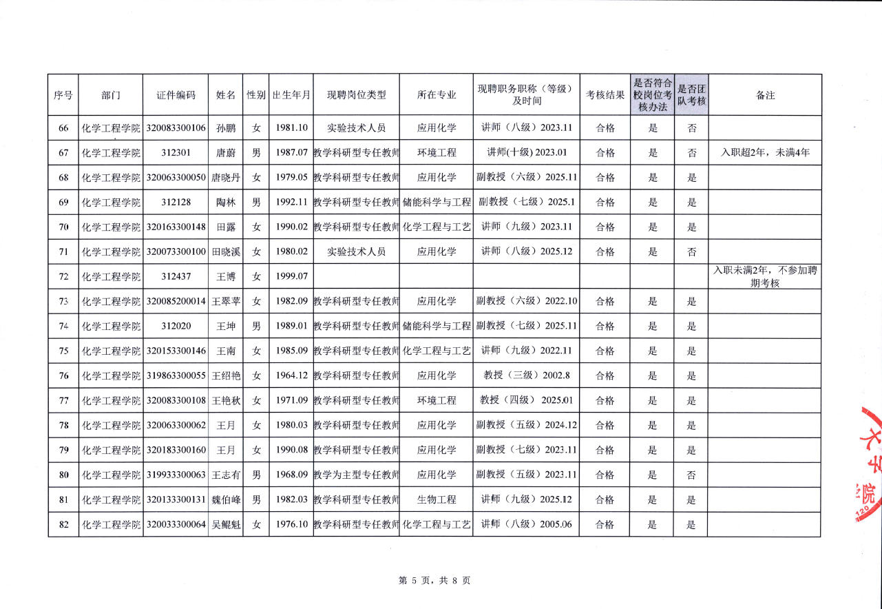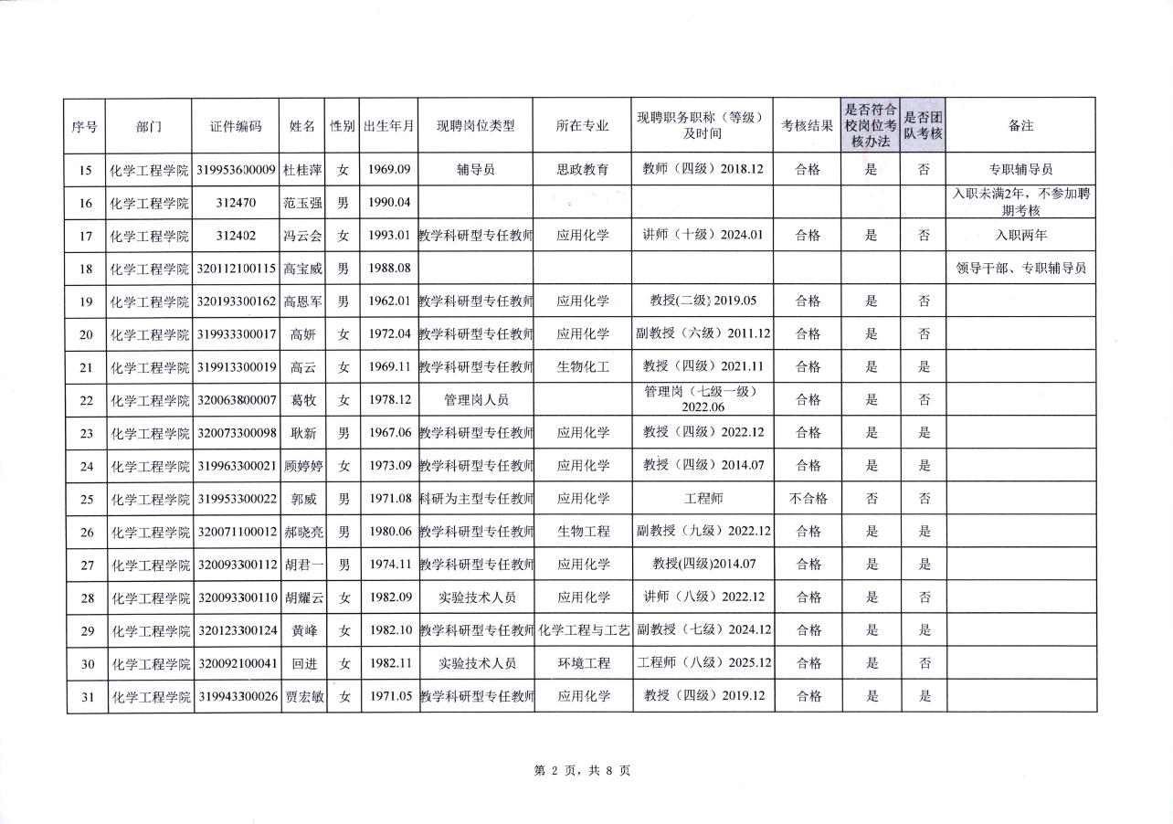 关于化学工程学院教职工2022-2025年聘期考核结果的公示