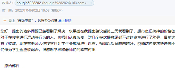 截止目前,后勤保障电话接到548通电话,坚持做到“水不过天,电不过夜”,做好物业服务和维修保障;8890投诉问题3件,回复学校关于疫情防控监督检查整改督办18单,共计解决问题38件;校长信箱收到14封,后勤处长邮箱收到63封,其中(咨询19封、建议34封、投诉24封)均已给出满意答复,已经陆续解决龙源公寓内没有水果摊、龙源学习场所灯不够亮、食堂饭菜辣、个别同学因疫情封闭管理导致出现焦虑恐慌等各类问题。做到确保师生在校有任何困难,都能有处诉求,有人答复,有效解决,让师生在校期间更好的去工作、学习、生活。学校师生纷纷表示,多种诉求渠道的开通,解决了疫情期间很多的急难愁盼问题,让他们感受到了学校的关爱与温暖。