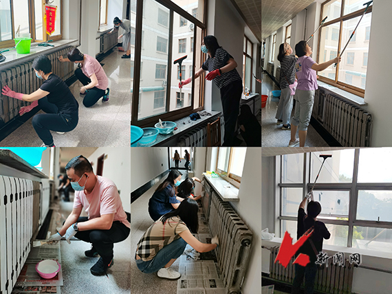 劳动中,教工党员干劲十足,不怕脏、不怕累。大家分工明确,有的负责擦玻璃,有的负责刷暖气,重活脏活抢着干。经过一上午的努力,学院二楼办公区的玻璃窗明几净、焕然一新。有的教工党员更是从家中带来了盆栽绿植,植物的摆放装点了走廊的环境,让走廊多了一抹绿色生机。