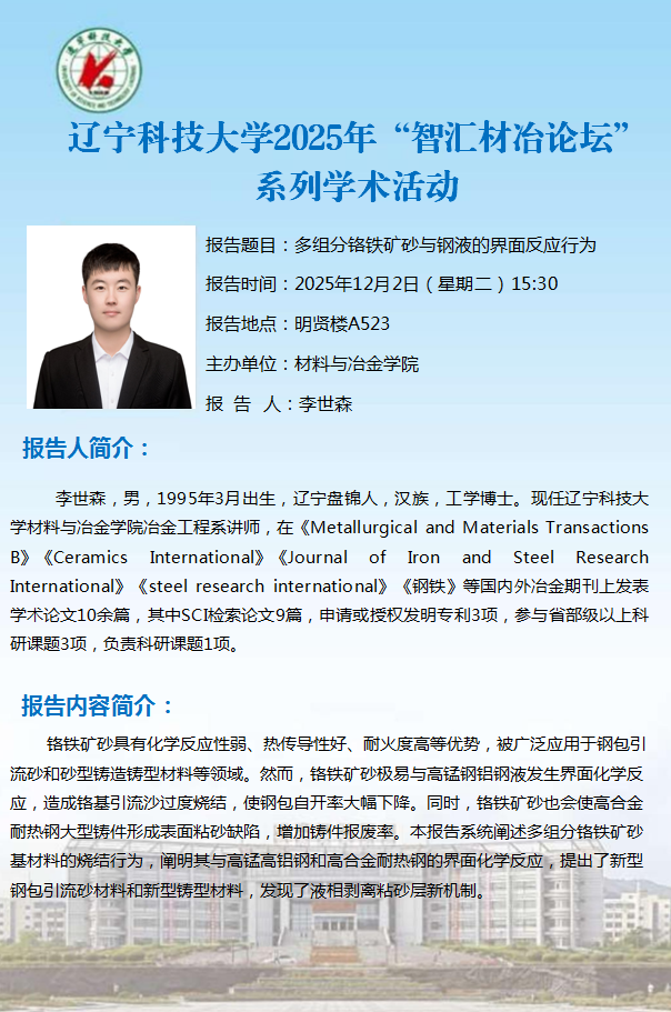 学术预告:多组分铬铁矿砂与钢液的界面反应行为