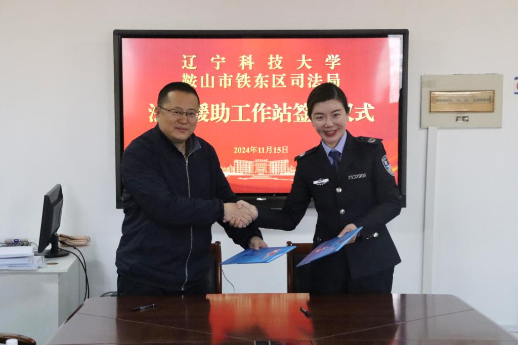 11月15日,辽科大经法学院与鞍山市铁东区司法局举行“法律援助工作站”签约仪式。本次签约仪式由经法学院副院长邵玲主持,铁东区司法局局长肖冰等一行6人、经法学院主要领导、教师代表及部分法学专业学生代表参加了签约仪式。