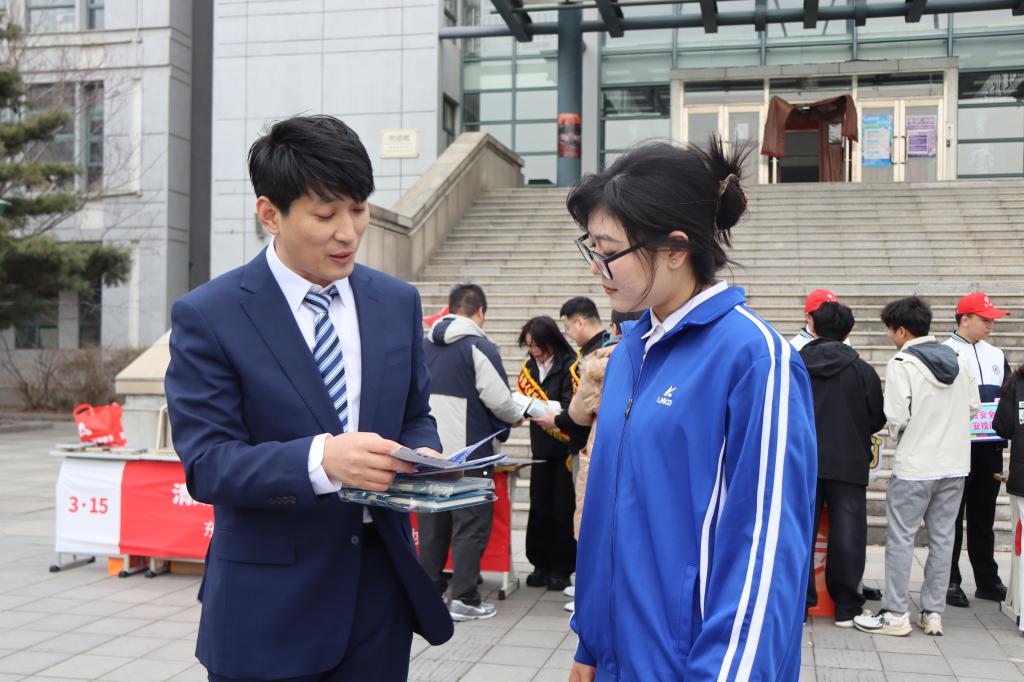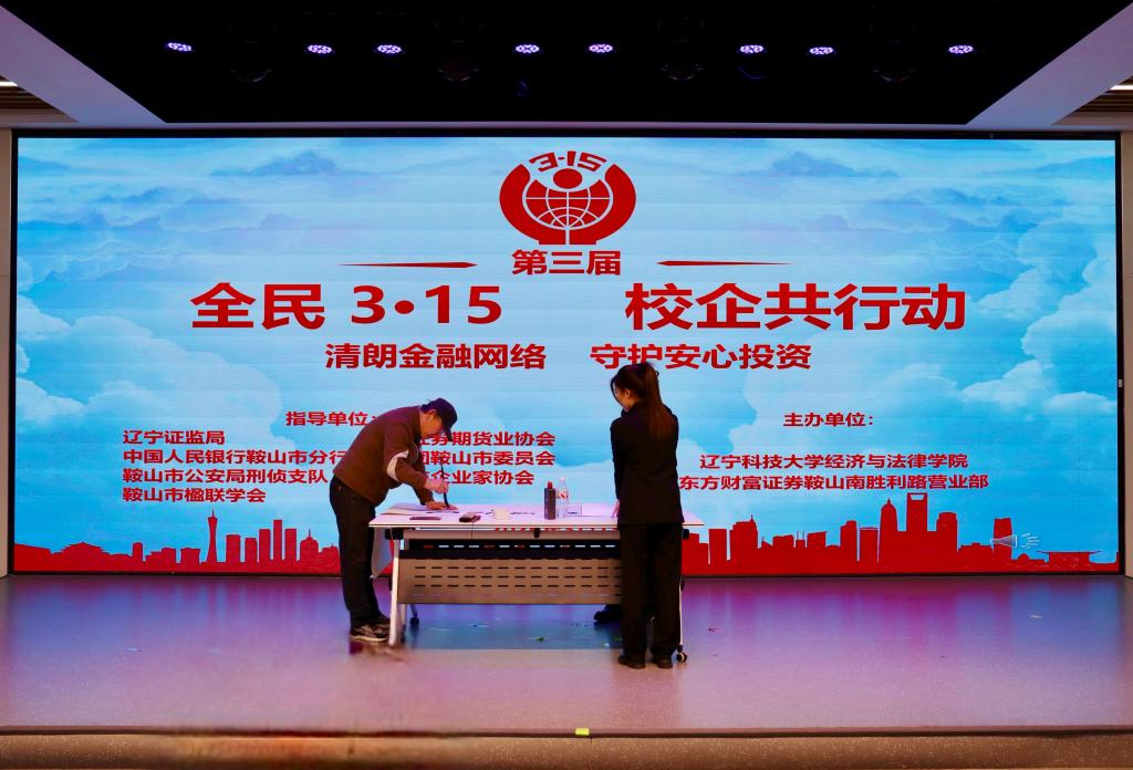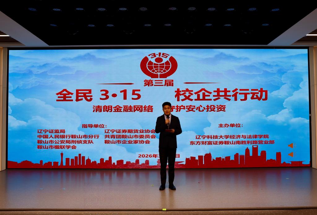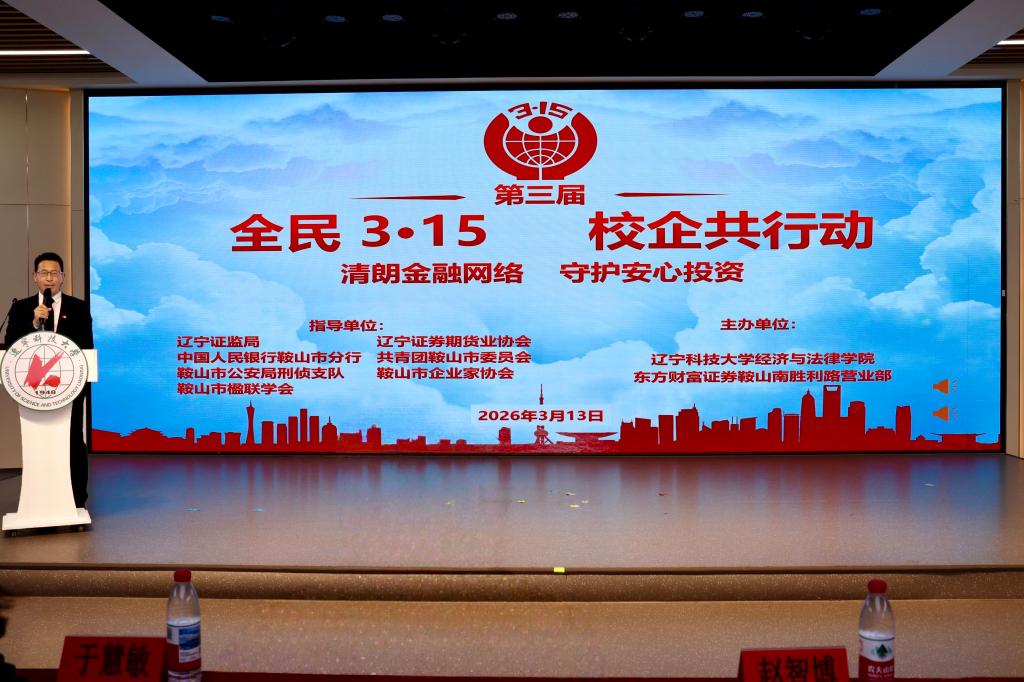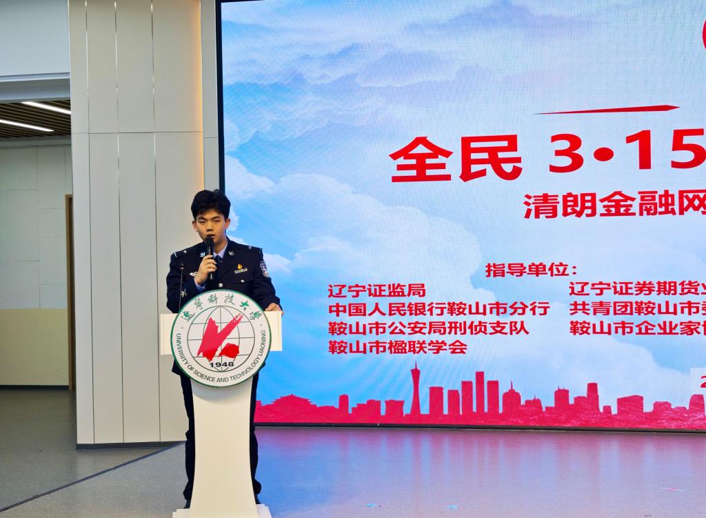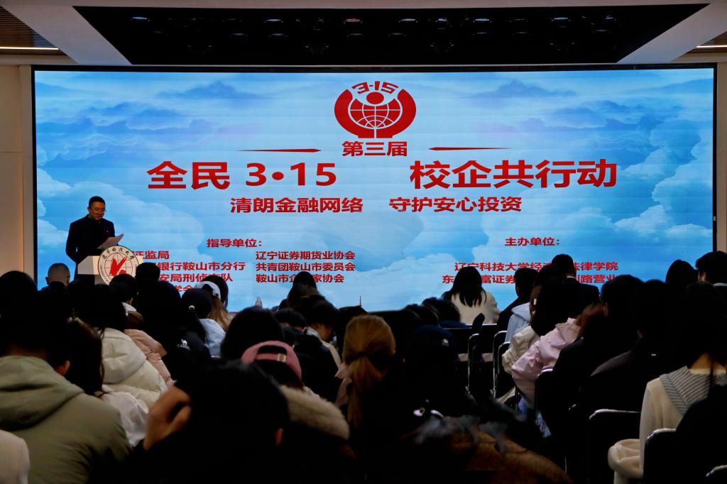 3月13日,经法学院携手东方财富证券鞍山营业部在大学生活动中心开展第三届“全民3·15,校企共行动”主题活动。本次活动旨在积极响应国家消费者权益保护号召,进一步普及金融维权知识,增强青年学生风险防范意识。活动得到了辽宁证监局、辽宁证券期货业协会、中国人民银行鞍山市分行、鞍山市公安局刑侦支队、共青团鞍山市委员会、鞍山市企业家协会、鞍山市楹联学会等多家单位的大力支持。活动由经法学院团委书记张鹏飞主持,校团委、学生工作处、安全保卫处、经法学院相关领导及全体大一学生参加。
