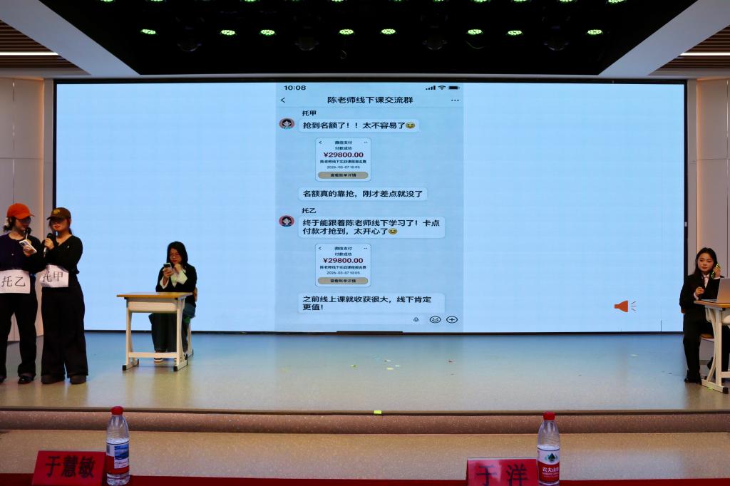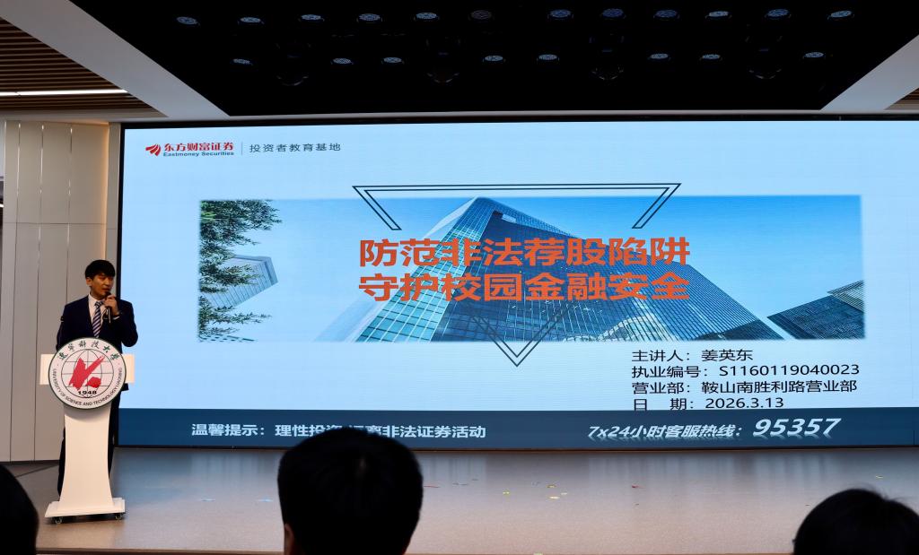 在一个多小时的户外宣传讲解后,东方财富证券鞍山南胜利路营业部总经理吴超在大学生活动中心致辞。他表示,良好的校园消费环境与学生切身利益密切相关,希望同学们树立理性、健康的消费观念,增强法律意识与风险防范意识。随后,辽宁科技大学学生与东方财富证券工作人员联合表演了根据真实案例改编的反诈主题情景剧,以直播间“名师荐股”为切入点,生动揭示“非法荐股”“杀猪盘”等常见诈骗套路。