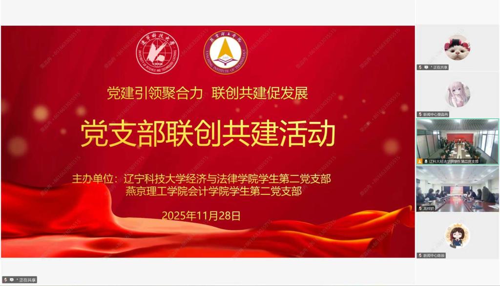 11月28日,辽宁科技大学经法学院学生第二党支部联合燕京理工学院会计学院学生第二党支部通过线上形式开展“党建引领聚合力 联创共建促发展”联创共建活动。辽宁科技大学经法学院党委书记赵智博、燕京理工学院会计学院党总支书记胡国超及各支部全体党员参加活动。会议由经法学院学生第二党支部书记张鹏飞主持。