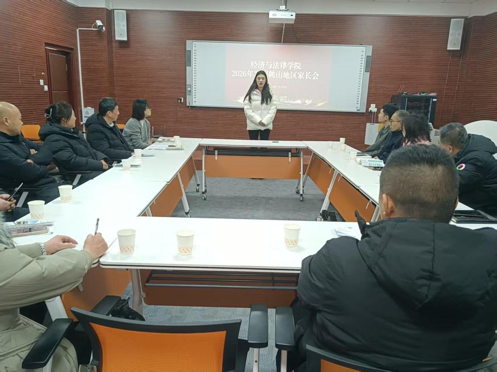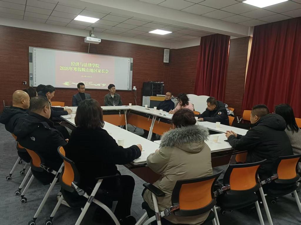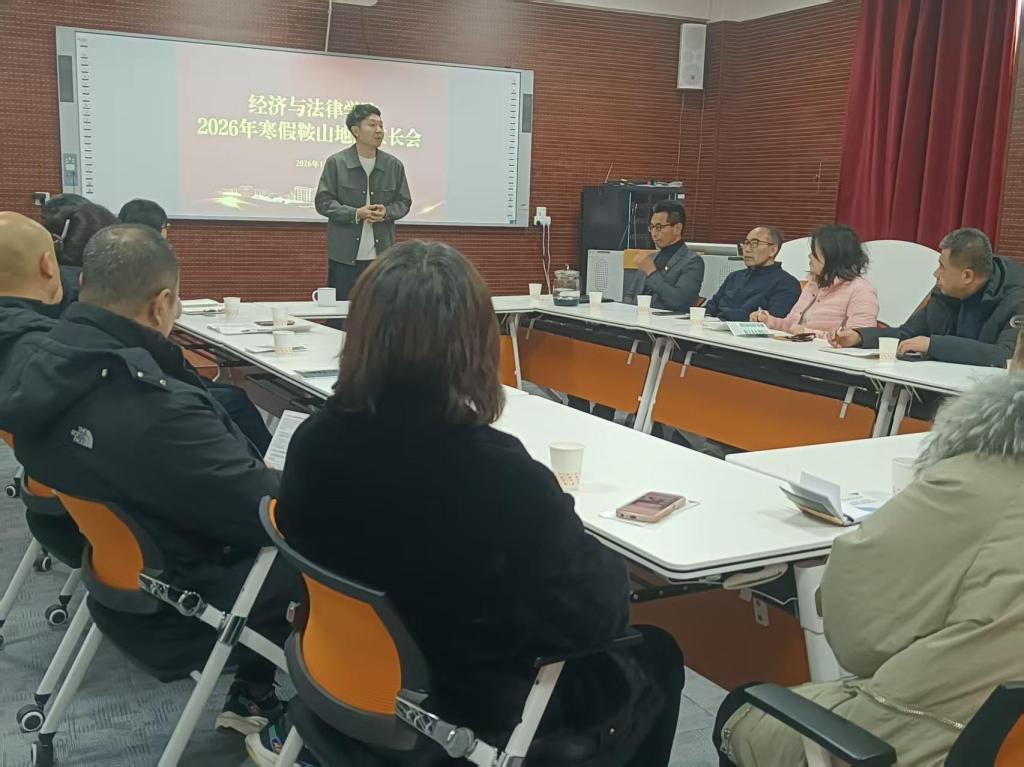 1月24日,经法学院在博识楼A407会议室召开2026年寒假鞍山地区家长会。学院党委书记赵智博,党委副书记、学生工作负责人张国华,学办主任李路云,福鞍集团人力资源部经理崔佳航,优秀学生榜样金融23-2班张珈奕及鞍山地区学生家长代表参加会议。