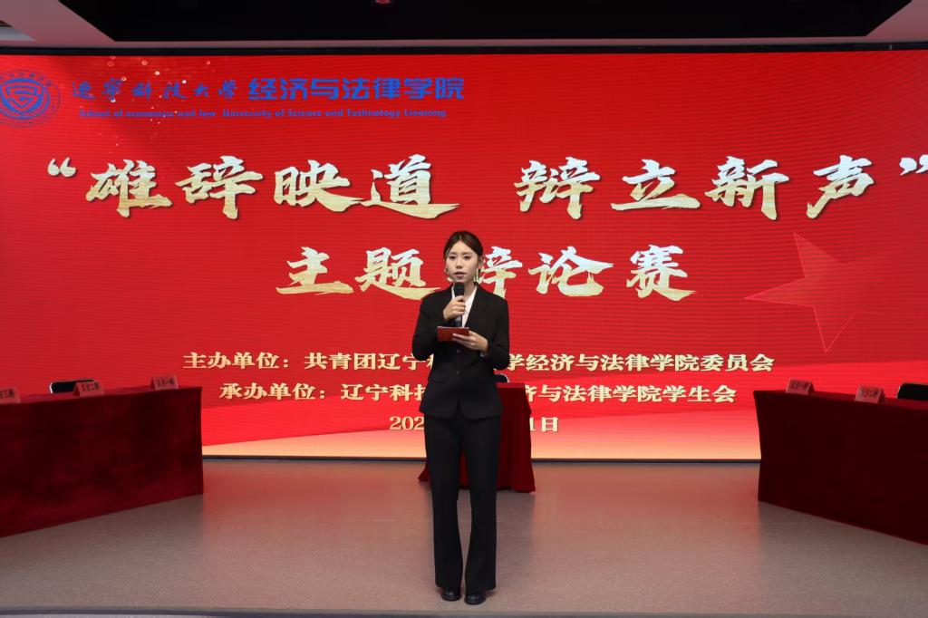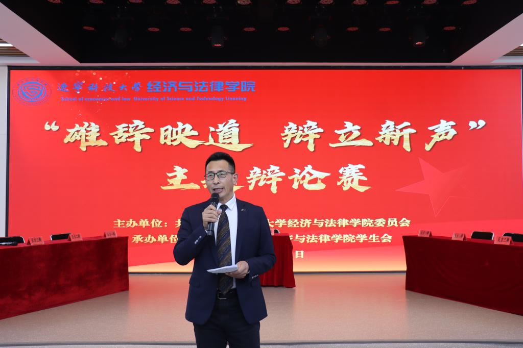 10月31日晚,经法学院在明德楼大学生活动中心成功举办“雄辞映道 辩立新声”主题辩论赛。学院党委书记赵智博、团委书记张鹏飞,以及学院团委、学生会各部门负责人出席活动。辽宁科技大学辩论队队长王斌、经法学院辩论队队长付帅、副队长苗舰担任比赛评委。本次活动由法学25-2班姜懿轩同学主持,2025级学生代表到场观赛。