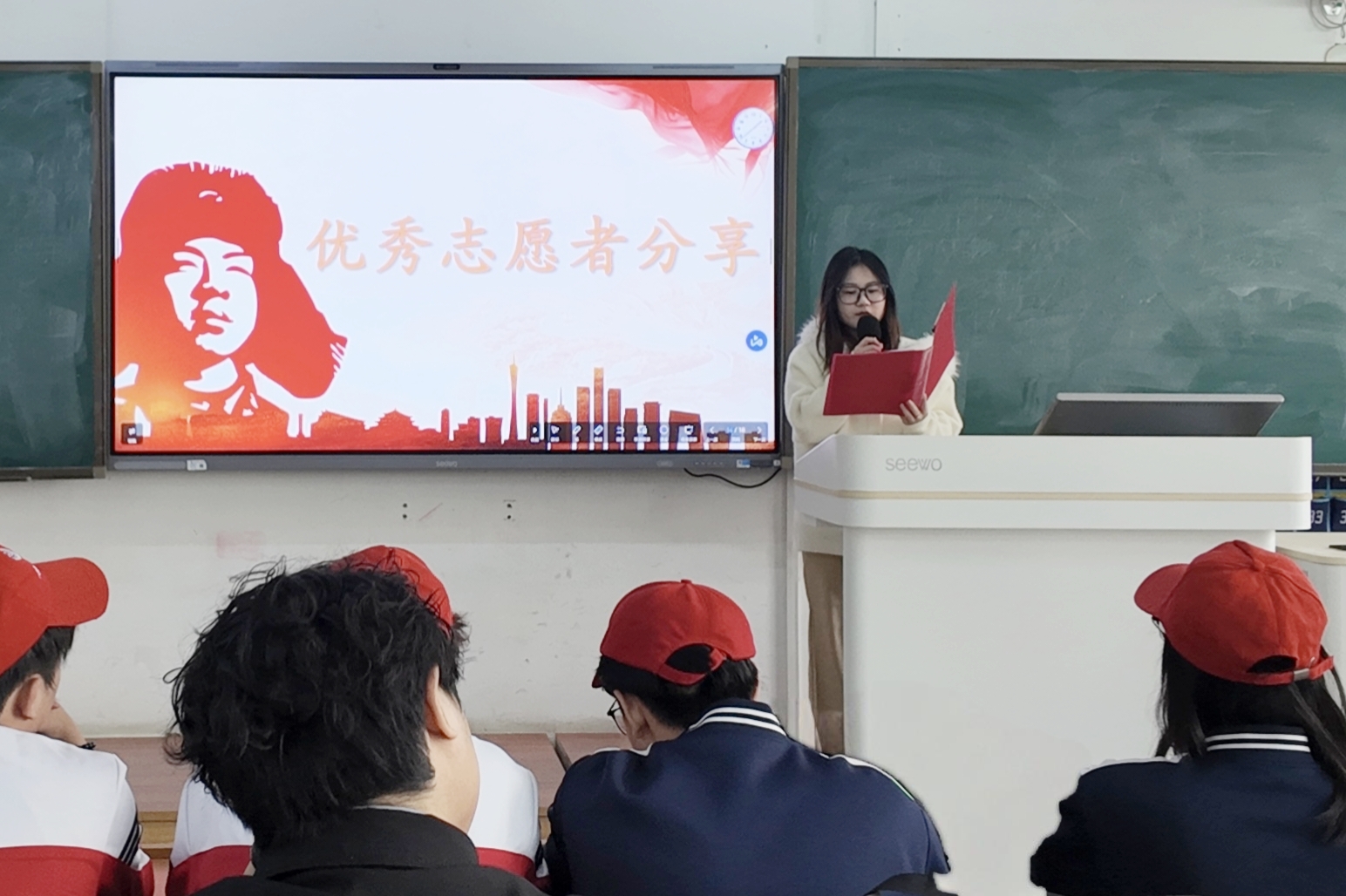 活动伊始,王跃儒将雷锋精神与志愿服务紧密结合,引导同学们深入思考雷锋精神的时代意义。随后,高欣雨从雷锋的生平事迹、雷锋精神的时代内涵与当代价值以及身边的榜样这三个方面向现场同学深度讲解雷锋精神的伟大,并介绍了郭明义、王顺友、白方礼等当代雷锋精神传承人的无私奉献,她表示,雷锋精神从来不是尘封的历史符号,而是跨越时代的价值追求……作为新时代青年,我们是雷锋精神最直接的传承者、实践者和弘扬者。志愿者代表何佳丽和邵雨欣分享了亲自守护绿色家园的经历,以及运用专业知识守护社区安全的故事,同学们,从中领悟到了志愿活动就在我们每个人身边,要以青春之名,许下志愿之约,生动诠释了新时代大学生的志愿服务精神。