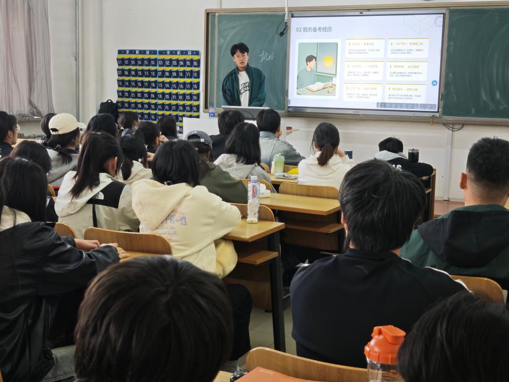 张鹏飞在开场致辞中指出,法考对法学专业学生的重要意义,强调法考备考是专业学习与职业发展的关键环节。他鼓励同学们把握交流机会,科学规划备考路径,夯实专业基础。随后,已通过法律职业资格考试的25级法硕研究生赵辛凯围绕法考备考经验进行分享。他从“法考基本介绍”“备考经历”“核心策略”三个方面展开讲解。首先,他对考试时间安排、科目构成及整体框架进行了系统梳理,帮助同学们建立清晰认知;其次,他结合自身备考经历,介绍了分阶段复习方法,包括基础阶段知识梳理、强化阶段重点突破以及冲刺阶段查漏补缺,强调循序渐进与体系化学习的重要性;最后,他从学习方法、资料选择与心态调整等方面提出具体建议,强调合理规划与稳定节奏对提升备考效率的关键作用。在互动环节,赵辛凯针对同学们在学习方面的疑问进行了细致解答,结合实际情况提出针对性改进建议,现场交流氛围热烈。最后,张鹏飞做总结发言,鼓励同学们科学备考、注重方法、保持心态稳定,在持续积累中提升学习成效。