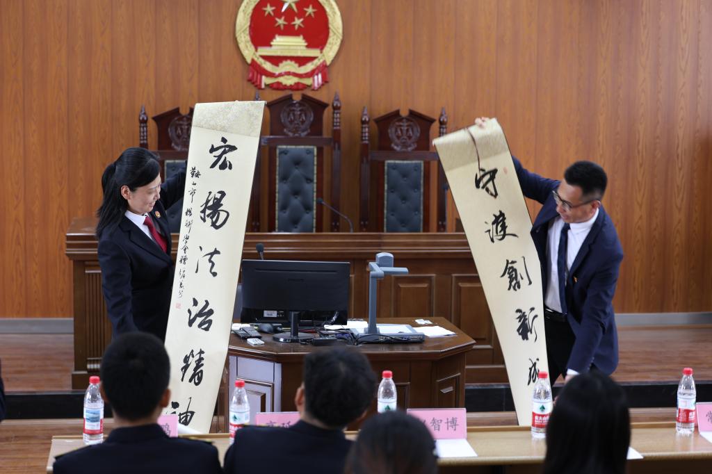最后,辽科大经法学院党委书记赵智博代表经法学院向鞍山市中级人民法院赠送题为“守护创新成果,弘扬法治精神”的书法作品并作总结讲话。他着重强调了知识产权保护工作的重要意义,鼓励同学们以本次模拟法庭活动为契机,把专业理论知识与司法实践紧密结合,运用所学法律知识守护创新成果,为完善知识产权强国建设体系,贡献青年学子的青春力量。
