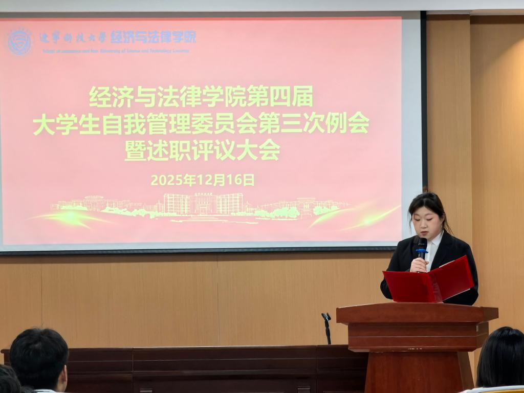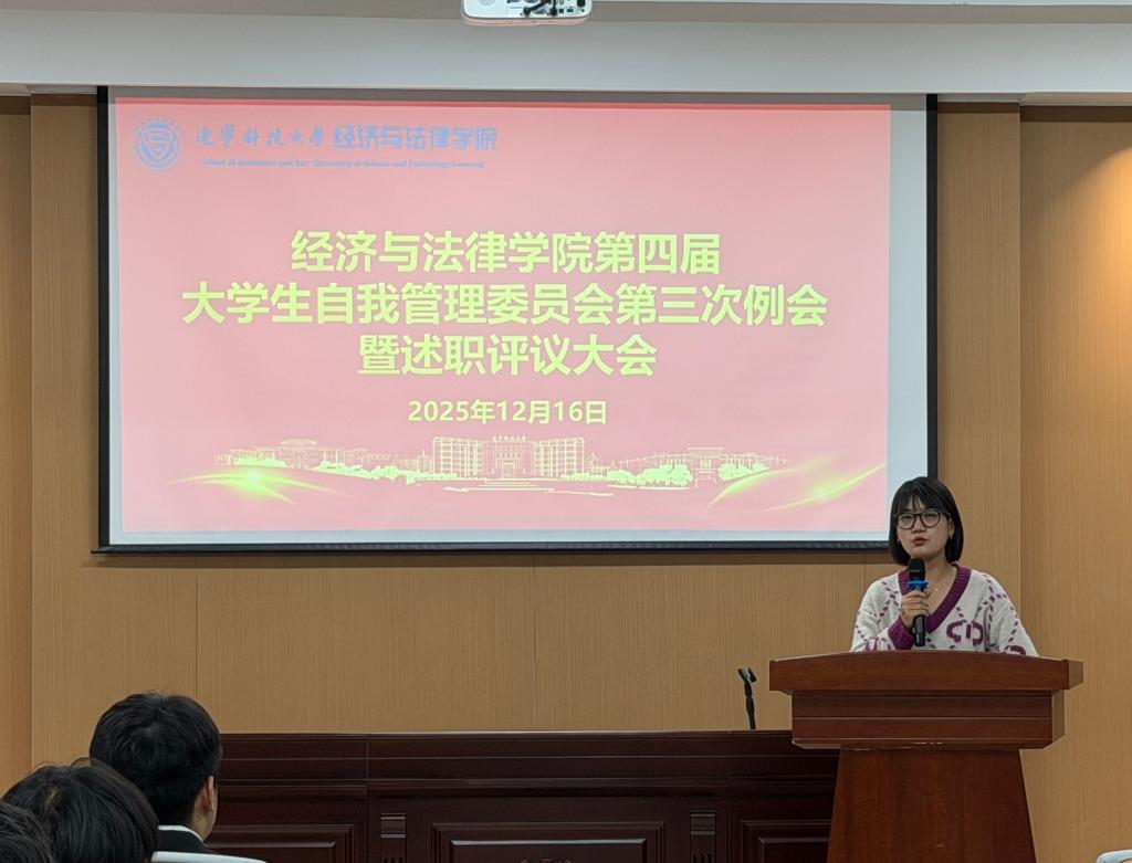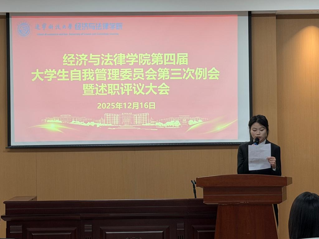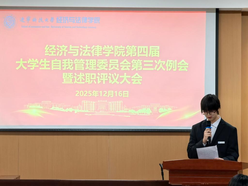 12月16日,经法学院于博识楼A402召开第四届大学生自我管理委员会(以下简称自管会)第三次工作例会暨述职评议大会。学院学办主任李路云出席本次大会,会议由经法学院自管会执行主席刘鑫喆主持,第四届自管会全体成员参加了本次会议。