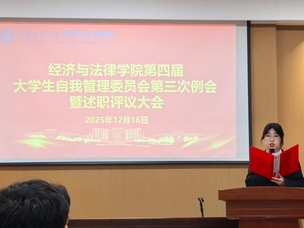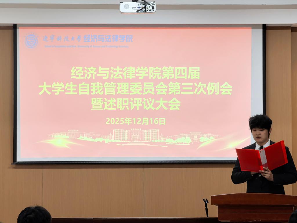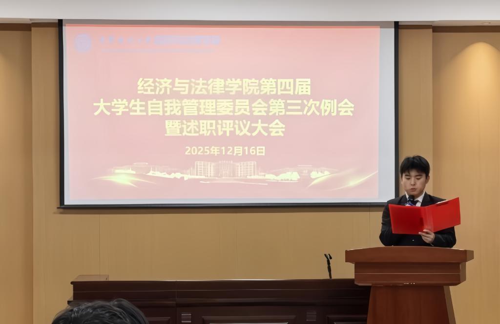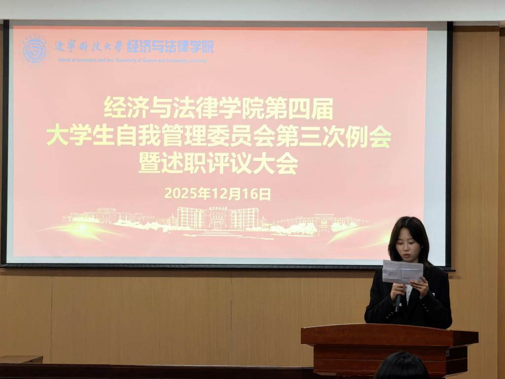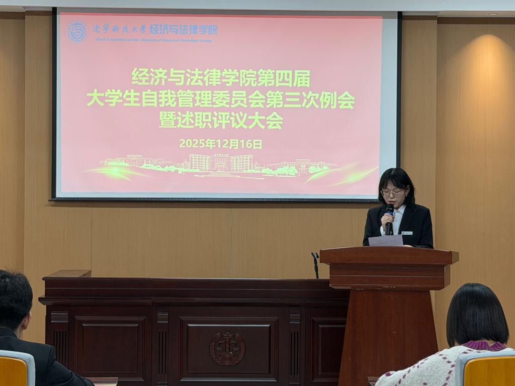 12月16日,经法学院于博识楼A402召开第四届大学生自我管理委员会(以下简称自管会)第三次工作例会暨述职评议大会。学院学办主任李路云出席本次大会,会议由经法学院自管会执行主席刘鑫喆主持,第四届自管会全体成员参加了本次会议。