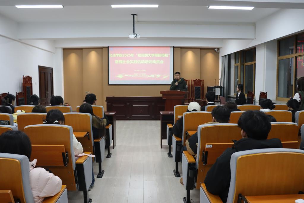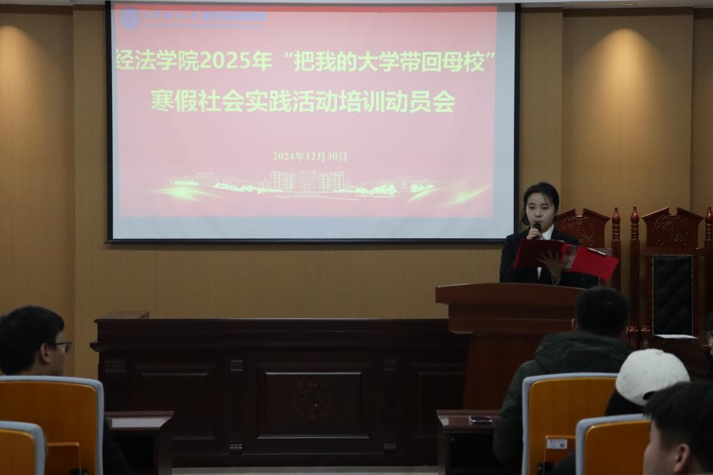 12月30日,经法学院于博识楼A402召开2025年“返家乡”寒假社会实践活动培训动员会。本次会议由经法学院团委实践与社团指导中心副主任宋昕主持,学院团委副书记张鹏飞、学院团委学生副书记兼实践与社团指导中心主任刘帅家以及学院100余名学生参会。