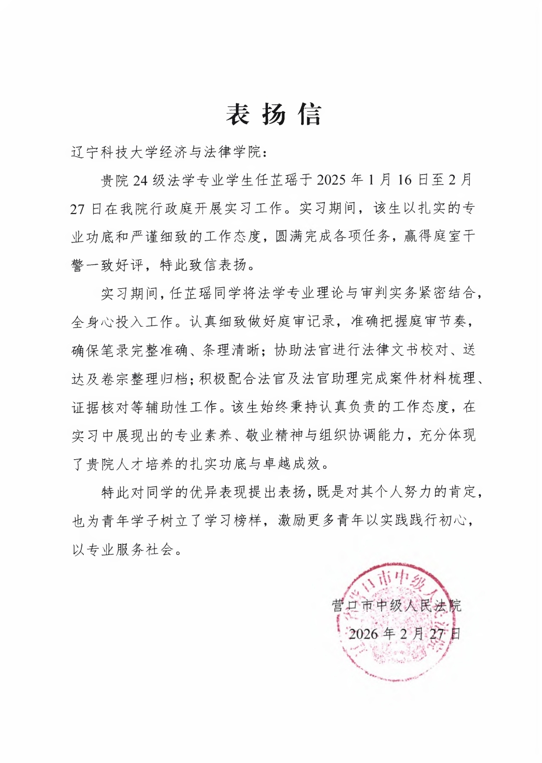 近日,经法学院收到了营口市中级人民法院行政庭发来的表扬信,对任芷瑶在实习期间认真负责的态度和严谨细致的工作作风给予充分肯定。这既是对经法学院教学育人的认可,也是对其在今后的学习中深耕法律领域的激励。