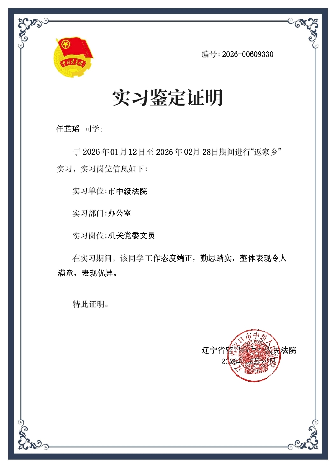 任芷瑶,女,共青团员,法学24班学生,现任辽宁科技大学学生会办公室工作人员、经济与法律学院团委组织委员,寒假期间她积极响应“返家乡”社会实践的号召,在辽宁省营口市中级人民法院开展志愿服务。