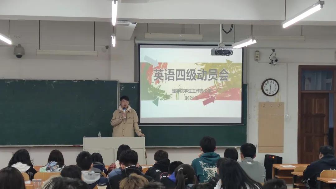 3月17日晚,理学院英语四级动员大会于博学楼A211教室顺利召开。本次会议由理学院学生工作办公室副主任高宝威主持,2019级和2020级全体同学参加。