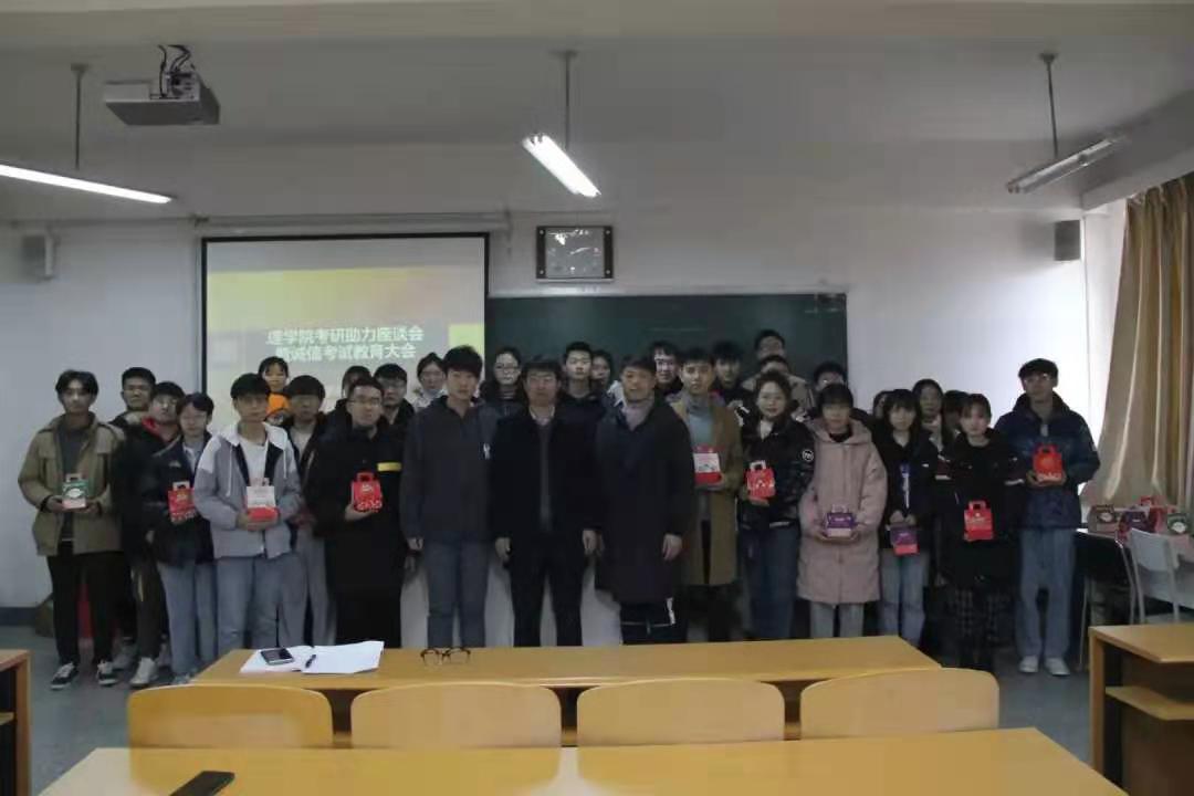 12月21日,理学院于明贤楼B315顺利召开考研助力座谈会暨诚信考试教育大会。会议由学生工作办公室副主任高宝威主持,理学院党委副书记兼副院长李宁、团委书记李翰博以及2017级各班考研生参加此次会议。
