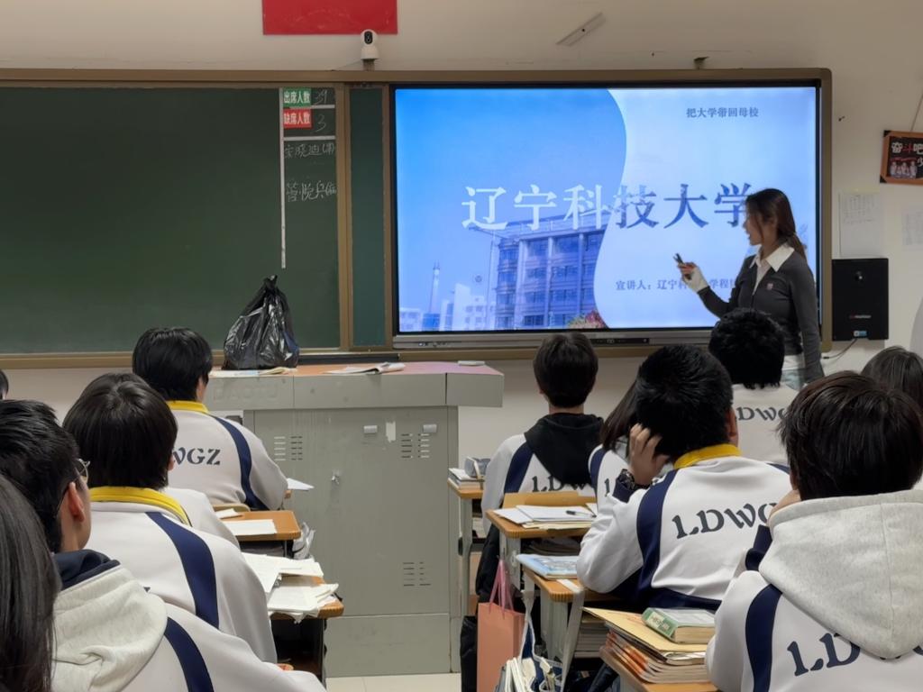 1月18日,由管力峰、程韫竹、唐宁徽、张鑫缘、尹春晓五位同学组成的“拾光回响队”前往辽东湾实验高级中学,开展“把我的大学带回母校”主题社会实践活动。团队成员精心筹备宣讲内容,从辽宁科技大学的学科优势、专业特色,到招生政策、校园文化,进行了全方位、多角度的介绍。宣讲现场,成员们结合自身高考备考经验与大学成长经历,分享了高效学习方法与大学生活适应技巧,并通过自制Vlog短片,生动展示了我校冶金工程、光电信息科学与工程等王牌专业的实训场景,以及科技竞赛、社团文化节等丰富的校园活动,让学弟学妹们对大学生活有了更直观、更立体的认知。互动环节,学弟学妹们围绕专业选择、高考冲刺规划、大学发展路径等问题踊跃提问,团队成员逐一耐心解答,不仅为他们答疑解惑,更以榜样力量激励大家坚定目标、奋力前行。活动期间,团队还向母校师生赠送了辽宁科技大学定制文创书签,进一步加深了高中母校对我校的了解与认同。未来将助力更多青年学子逐光而行、圆梦青春。