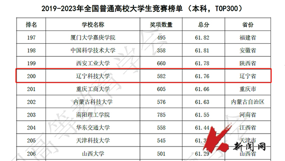 全国普通高校大学生竞赛排行榜每年发布一次,是国内第一个专注高校创新人才培养暨学科竞赛成果的排行榜。据统计,全国共有1218所本科院校纳入《2023全国普通高校大学生竞赛分析报告》,在《2019-2023年全国普通高校大学生竞赛榜单(本科,TOP300)》中,辽科大以奖项数量582项,总分61.76的成绩位列全国第200名,辽宁省第8名,相比较2022年在全国的排名上升6位。这也是学校连续4年进入全国前300名,连续3年进入辽宁省前10名。