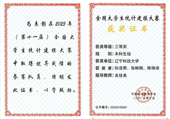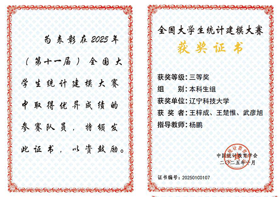 近日,2025年(第十一届)全国大学生统计建模大赛落幕。辽宁科技大学两支本科生团队凭借出色表现,双双荣获全国三等奖,创下学校自参加该项赛事以来的最佳成绩。