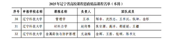 近日,辽宁省教育厅发布了《关于公布2025年辽宁省高校课程思政精品课程遴选结果的通知》(辽教通〔2025〕500号),辽宁科技大学本科课程“管理学”“材料力学”“金属腐蚀与防护原理”成功入选。