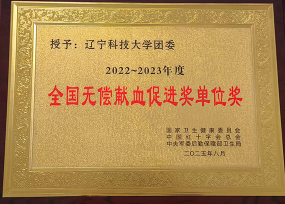 近日,国家卫生健康委员会、中国红十字会总会、中央军委后勤保障部卫生局联合发布《关于表彰2022-2023年度全国无偿献血表彰奖励获奖者的决定》(国卫医急发〔2025〕11号),辽宁科技大学团委被授予“全国无偿献血促进奖单位奖”。