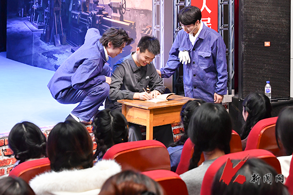 课程第一讲《青春雷锋》以辽科大原创舞台剧《雷锋——恰在青春时》为课程主课件,以走近雷锋、回望雷锋、体验雷锋为教学主线,融汇沉浸式艺术表演与美育思政教学互动,引导青年在体验式课堂和角色代入中逐渐领悟“何为雷锋”“何以雷锋”的深刻命题。课程通过还原历史场景打造沉浸式互动体验和观演区。步入艺术学院大门,即象征着步入鞍钢厂区,斑驳的砖墙与轰鸣的轧机声扑面而来。大厅展陈着力还原二十世纪五六十年代的鞍钢历史风貌,同时设有“重温雷锋日记”“手绘雷锋”“雷锋我想对你说”三个工坊的轻体验区,以及孟泰角、雷锋宿舍、鞍钢职工俱乐部、焦化厂建设工地四个深度体验区。学生既可以在观演前后参与“体验雷锋的一天”完成7项打卡任务,也可以在观演过程中与台上演员互动并即兴加入剧情发展。在“抢救水泥”单元中,台下观演的几名同学主动上台,奋力奔向“仓库”,用自己外衣盖住散落的水泥袋,用身体筑起一道防雨屏障——那一刻,青春与信仰在汗水中完成具象交接。