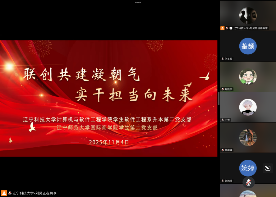 为进一步强化高校基层党组织建设,搭建跨校党建经验交流平台,凝聚青年党员奋进力量,11月4日,辽宁科技大学计算机与软件工程学院学生软件工程系升本第二党支部与辽宁师范大学国际商学院学生第二党支部 “云端” 相聚,联合举办 “联创共建凝朝气、实干担当向未来” 主题活动。辽宁科技大学计算机与软件工程学院学生软件工程系升本第二党支部书记刘昊、辽宁师范大学国际商学院学生第二党支部书记于兴扬,及两个支部全体学生党员共同参与。