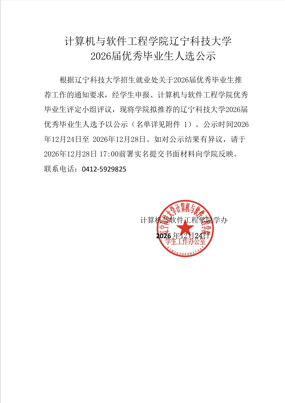 计算机与软件工程学院辽宁科技大学2026届优秀毕业生人选公示