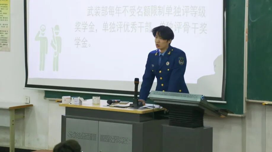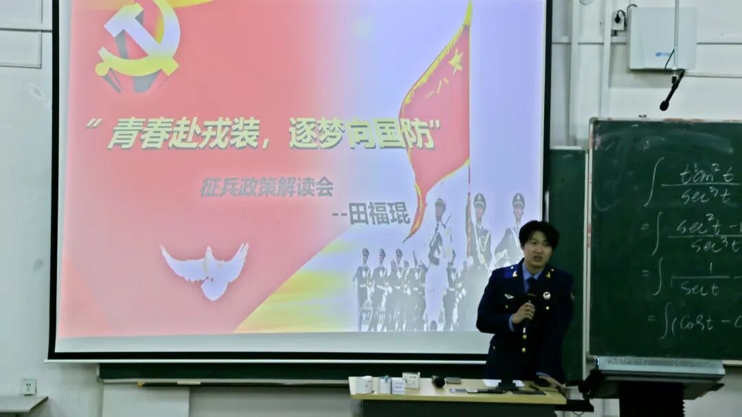 会议伊始,田福琨从经济待遇、学校政策、入伍时间建议、升学就业优惠、征集对象条件及应征流程等七大方面进行系统讲解。他重点介绍了义务兵两年服役期间可享受的多重经济保障,详细说明了退役复学后可不受原分数限制转专业、在校期间参加应急分队可享受成绩加分、顺利毕业保障及单独评定奖学金、优秀干部等倾斜政策,极大减轻了同学们“入伍影响学业”的后顾之忧。