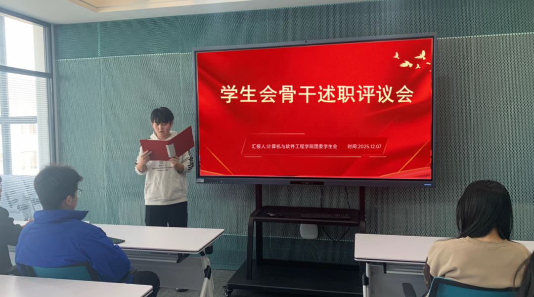 12月7日上午10:30,计算机与软件工程学院学生会骨干述职评议会在一站式505会议室顺利召开,分团委宣传委员王雨萍进行汇报。