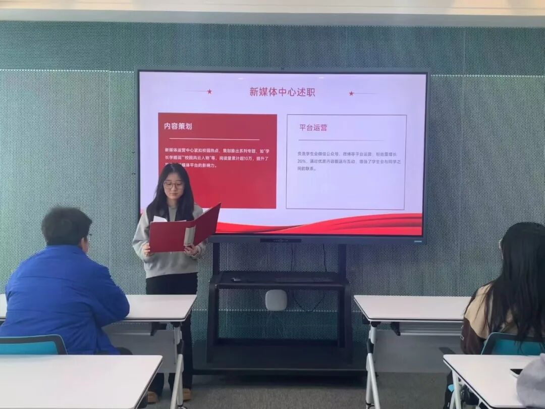 汇报人孙鹤轩在汇报中提到,在工作开展期间,新媒体中心组织第十二届“金话筒”主持人演讲比赛,联合生活部举办了第十九届寝室文化节。承担各类校园活动的拍照记录与新闻撰稿任务;负责学公众号、网站运营,同时提供礼堂设备调试技术支持,为啦啦操、大合唱等活动剪辑背景视频,为学院各项活动开展提供了有力支撑。