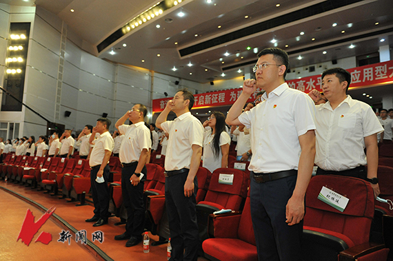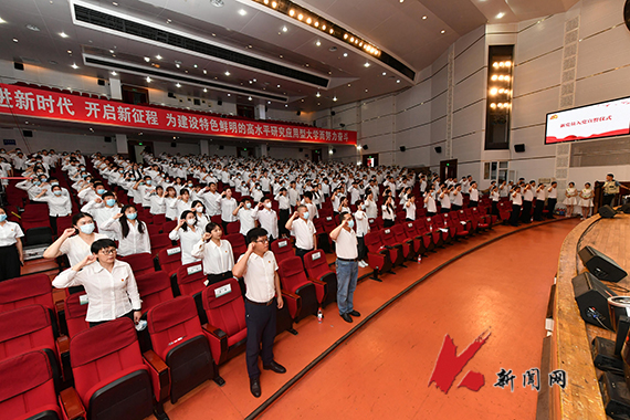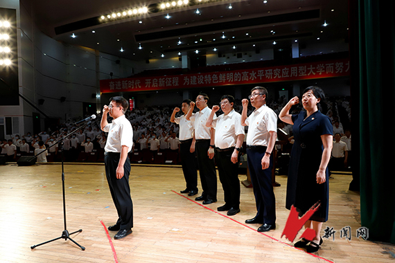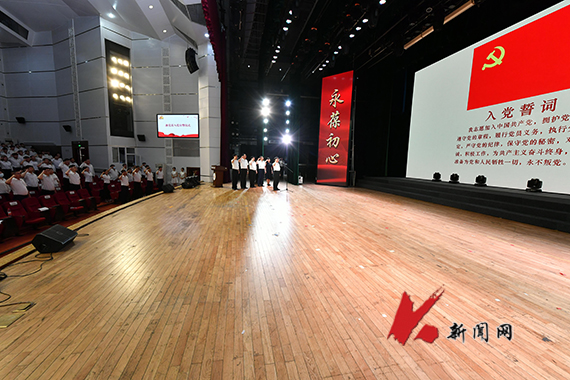 宣誓仪式在雄壮的《国际歌》中拉开序幕,全校350名新党员代表面向鲜红的党旗,在李平的领誓下,向党和人民许下了郑重誓言。现场的老党员重温入党誓词。宣誓结束后,新党员代表作表态发言。