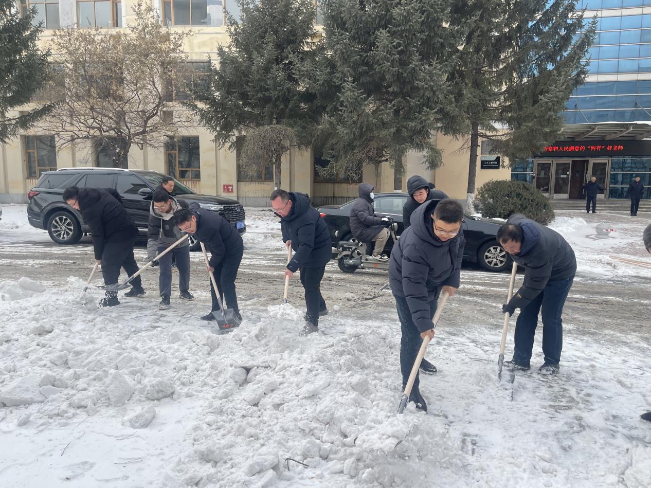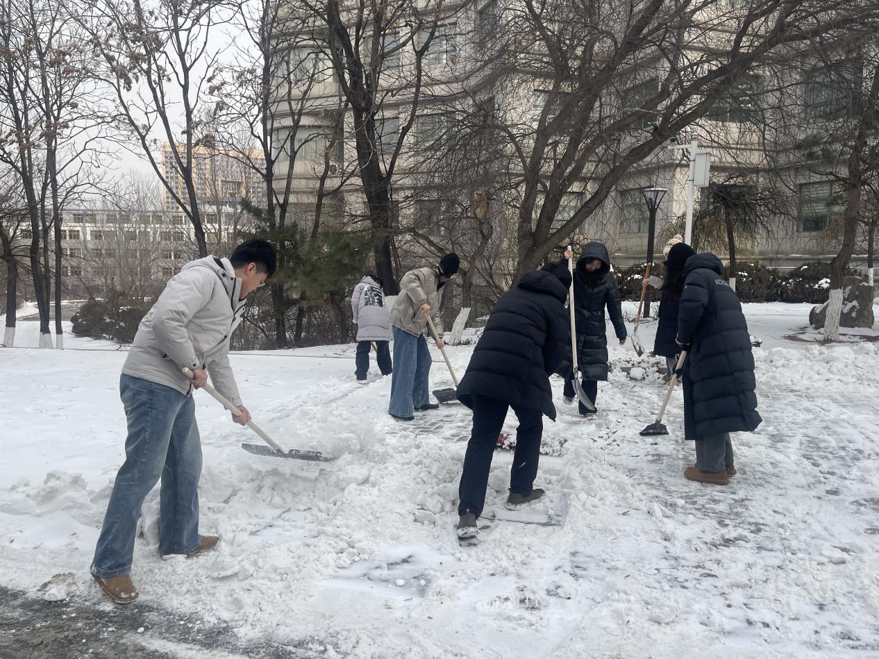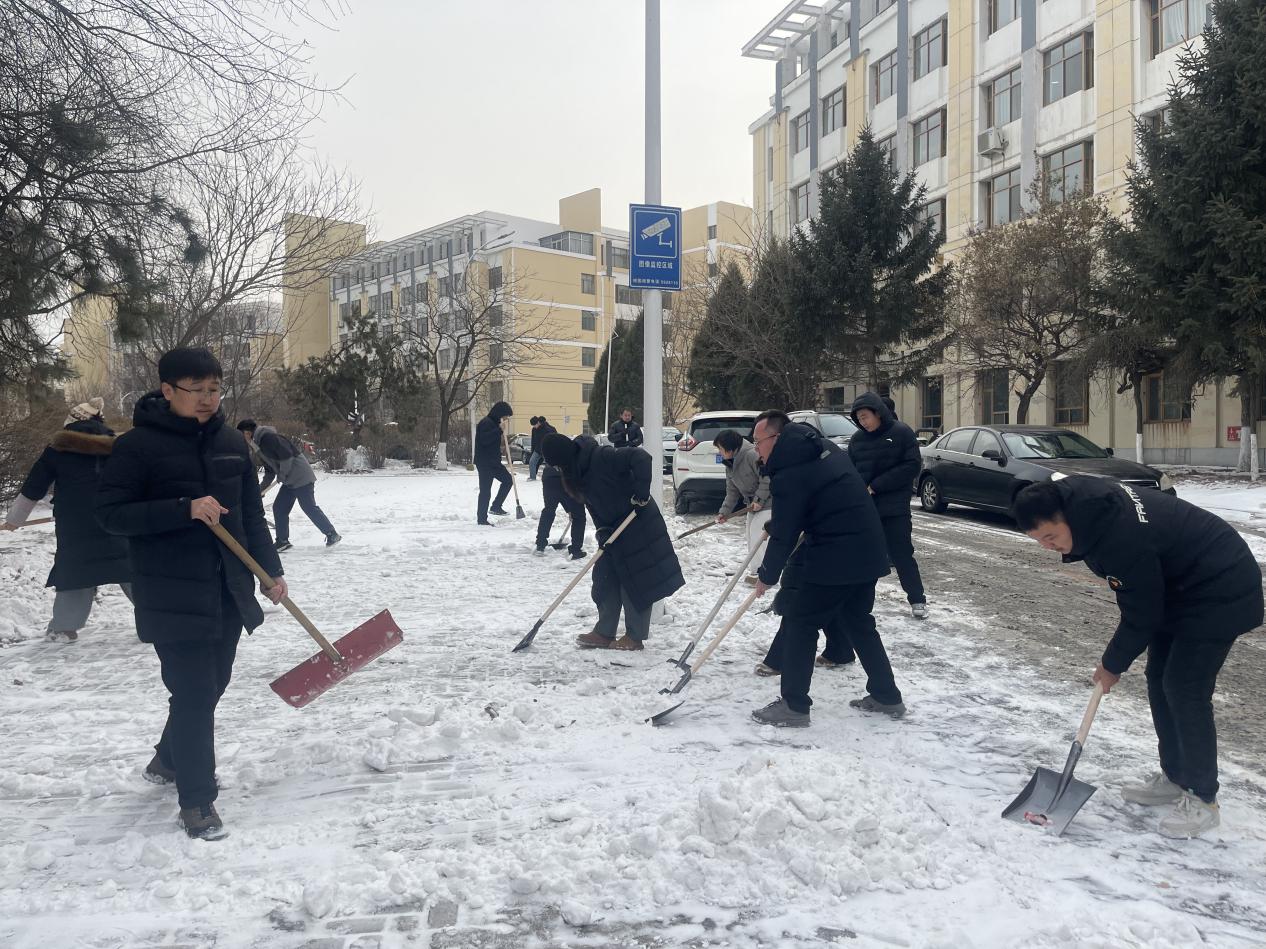 雪后气温走低,部分积雪已凝结成薄冰,增加了清扫难度。学院领导率先垂范、带头冲锋,手持铁锹奋力铲开厚雪,用实干带动干劲;教师们纷纷拿起工具加入队伍,不畏严寒、分工协作,铲雪、清冰、扫净一气呵成。铁锹与地面的撞击声、彼此鼓劲的吆喝声交织成冬日序曲,忙碌的身影成为雪天里最温暖的风景线。