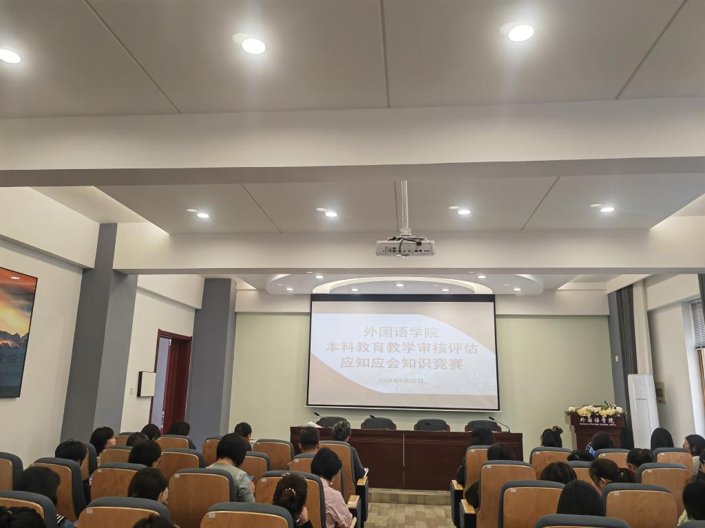 9月29日下午,外国语学院在博识楼A208会议室举办本科教育教学审核评估应知应会知识竞赛。此次活动由外国语学院分工会主办,竞赛旨在做好新一轮本科教育教学审核评估工作,提高学院全体教职工对于审核评估的认识,力争做到全员应知应会。