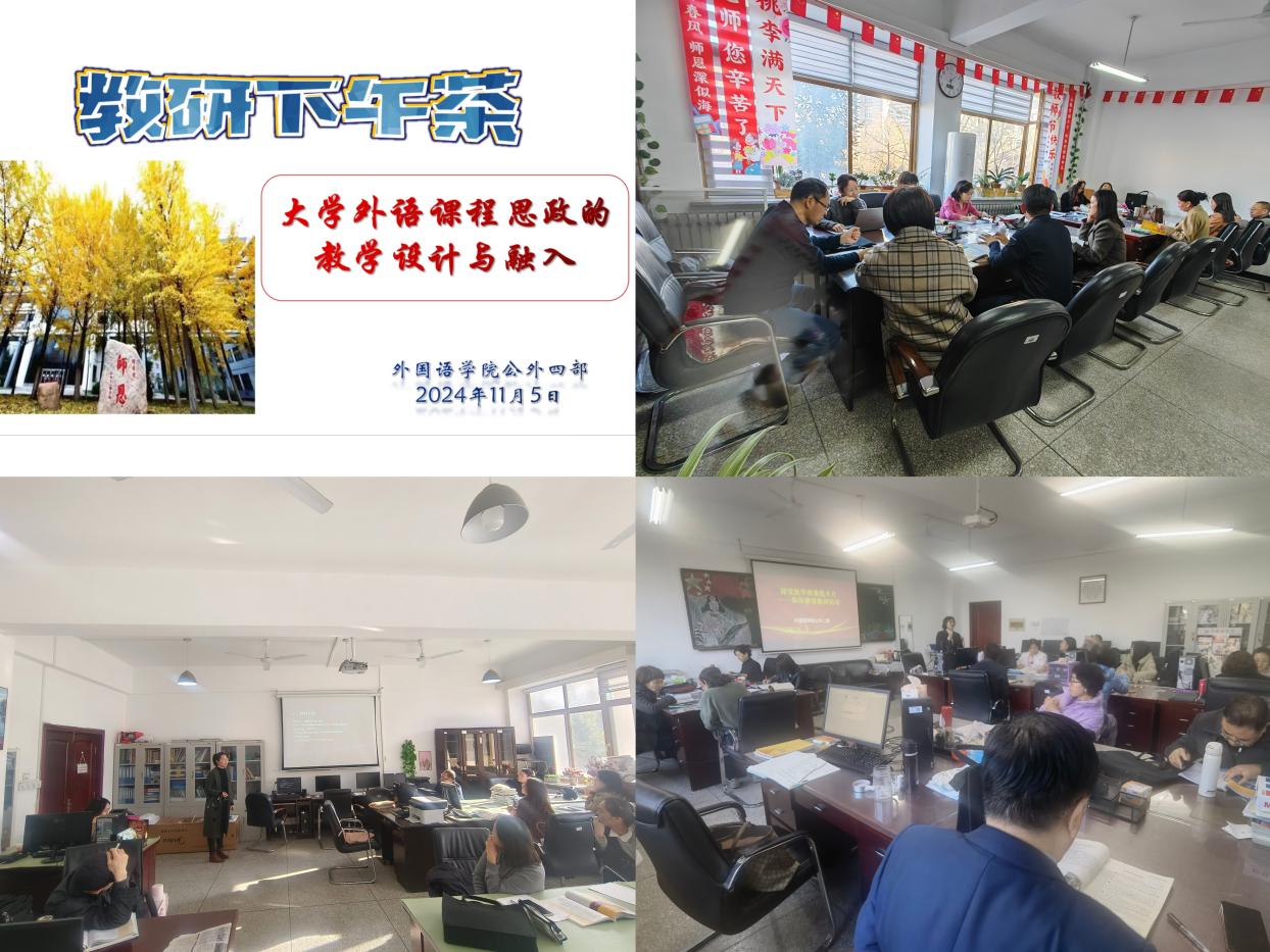 公外四部教研活动的主题为《大学外语课程思政的教学设计与融入》。张晶薇和王媛两位老师结合自身多年来的教学经验和关于课程思政方面的参赛和研究经历作了分享。在交流研讨环节,教师们积极发言,结合教学内容分享了自己在课程思政教学中的经验和心得,并就课程思政的评价方式和融入点等问题展开了热烈讨论。校督导王忠军肯定了教师们在课程思政教学中的积极探索和实践,并鼓励大家继续深化教学改革,加强课程思政研究,不断提升教学水平,为培养具有国际竞争力的高素质人才贡献力量。(撰稿:孙贵兵)