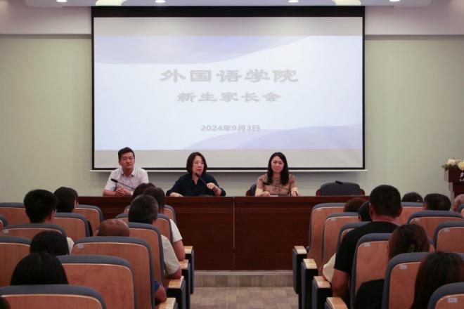在新生家长会上,院长蔡丽华首先致欢迎辞,介绍了学校和学院的基本概况。随后,副院长石峰围绕英语专业师资力量、课程设置、专业亮点、特色优势、培养目标等方面为家长们详细介绍了英语专业。最后,学院党委书记王晓建进行了总结讲话,分享了思想政治素养、人身财产安全、心理健康教育和专业素养提升等方面的学生教育管理方法和理念。她表示,家长要多与孩子和学校交流沟通,了解孩子的思想动态,支持孩子学业发展,共同促进孩子成长成才。