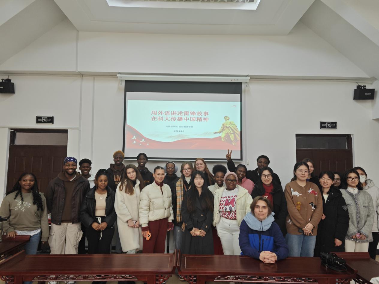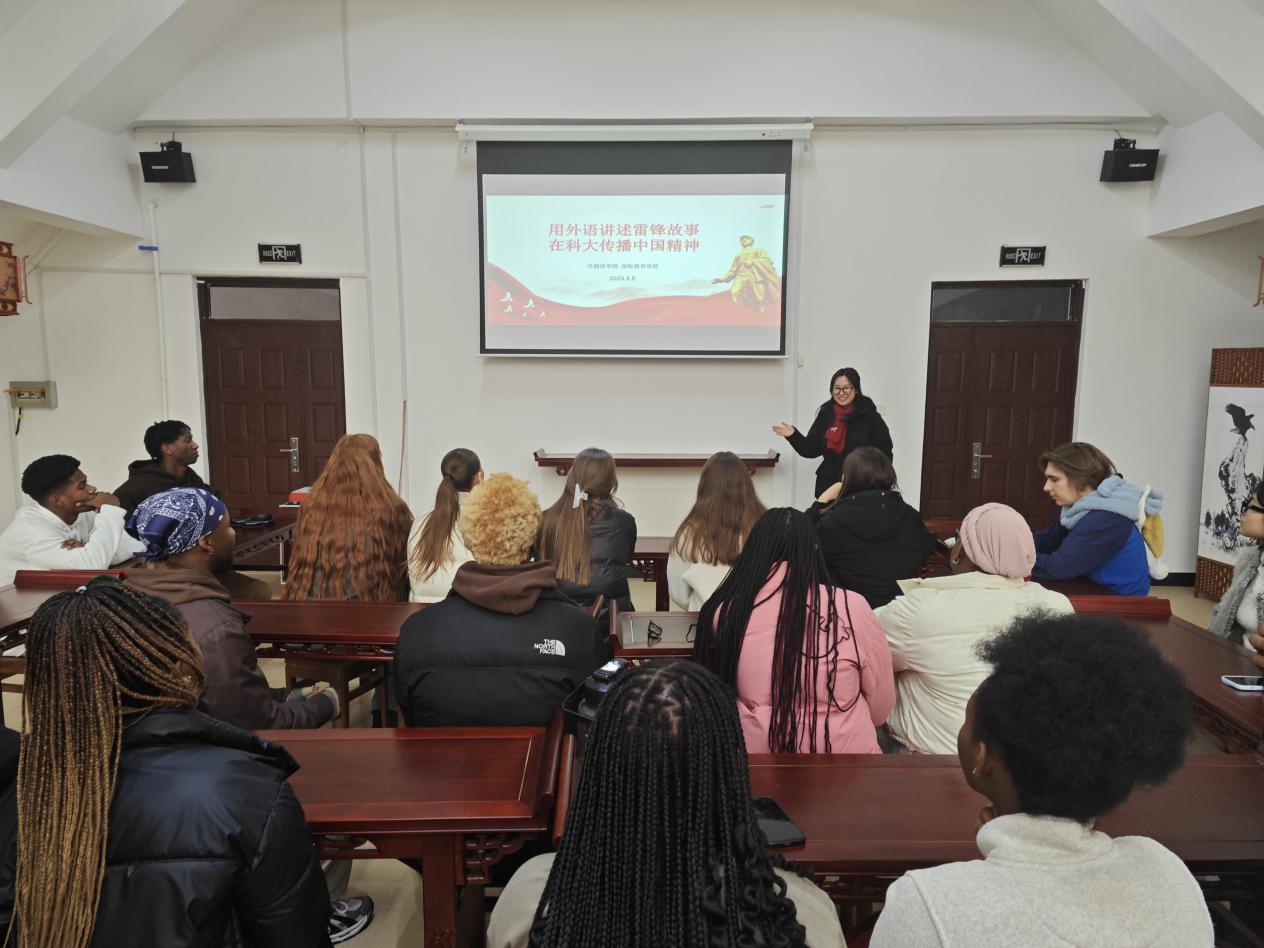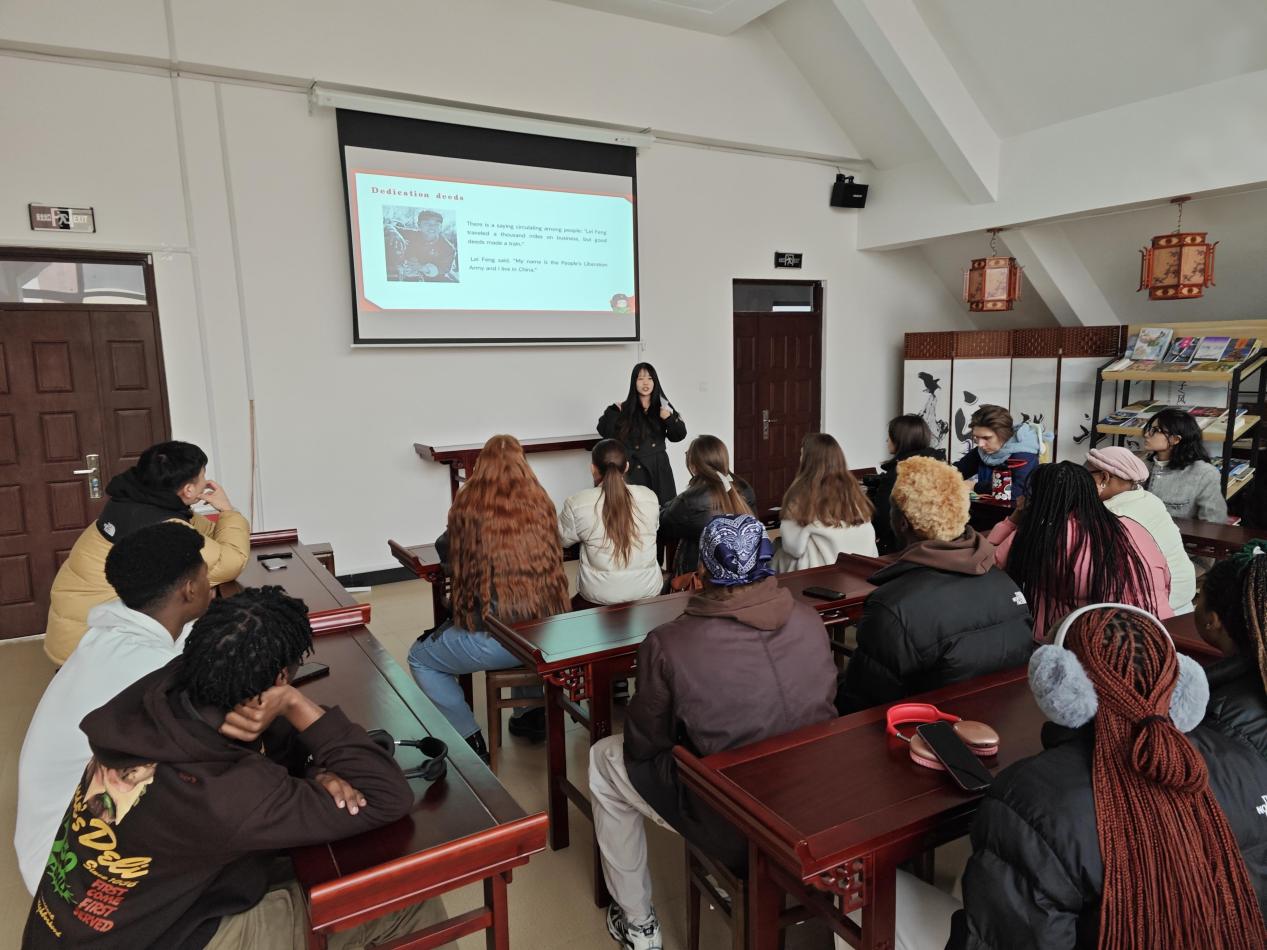 在活动中,学生骨干们用流利的英语讲述了雷锋的事迹,深情地展现了雷锋同志乐于助人的品格。他们利用PPT展示了雷锋的影音片段、老照片、书籍和报纸等资料,生动地再现了雷锋冒雨送老人回家、带病前往工地帮忙、匿名向公社捐款等感人至深的事迹,勾勒出他短暂而辉煌的一生。在交流分享环节,现场气氛活跃。留学生们积极讨论,分享他们的感想,并对雷锋无私奉献的精神表示钦佩。