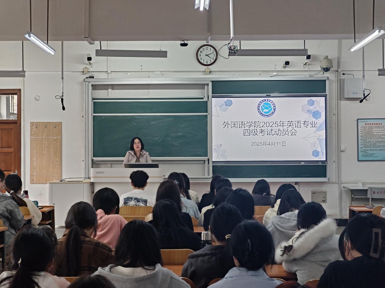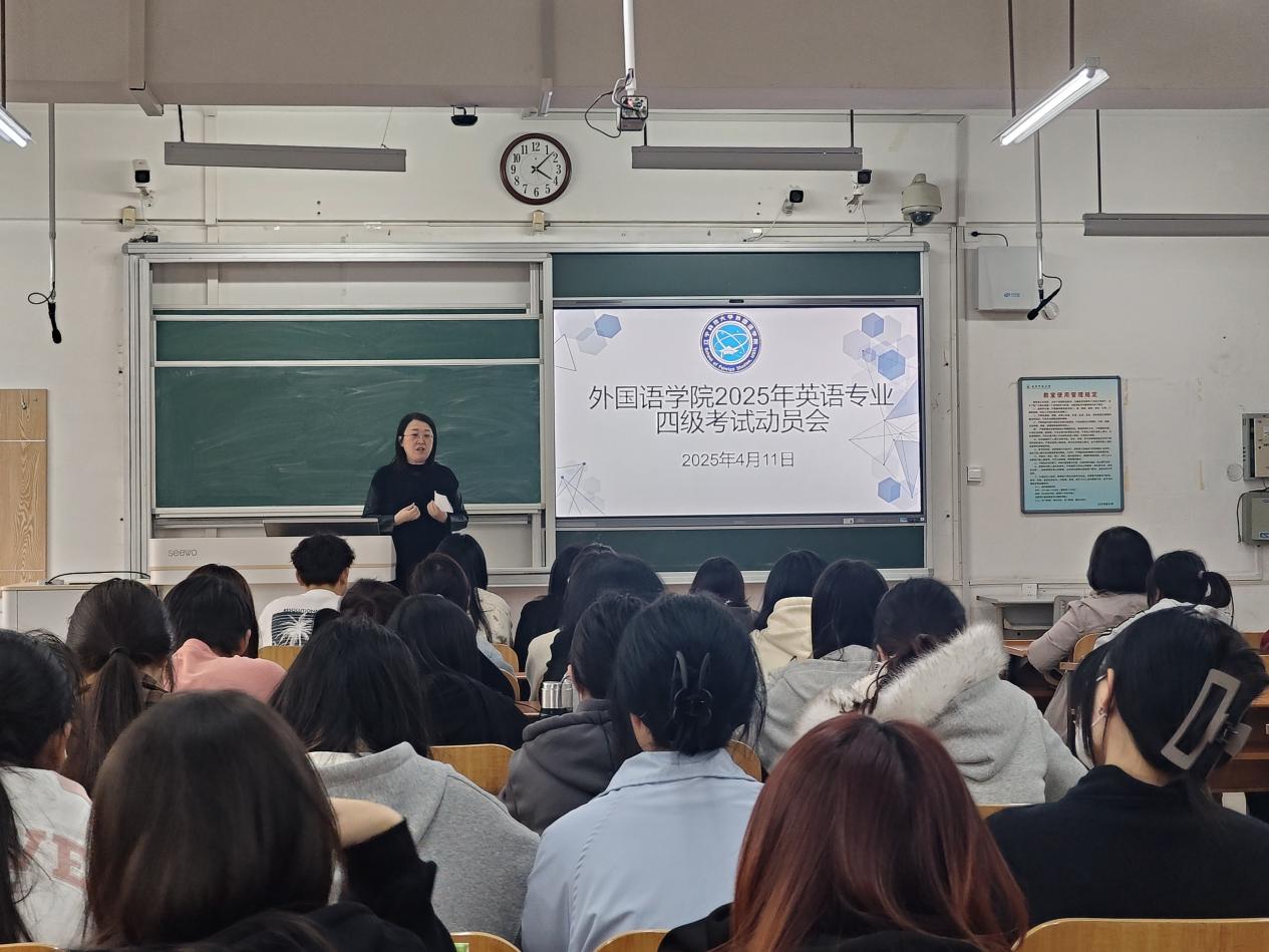 4月11日,辽科大外国语学院在博学楼C208教室召开2025年英语专业四级考试动员会,学院领导、英语专业负责人、学办负责人和本科生80余人参会。