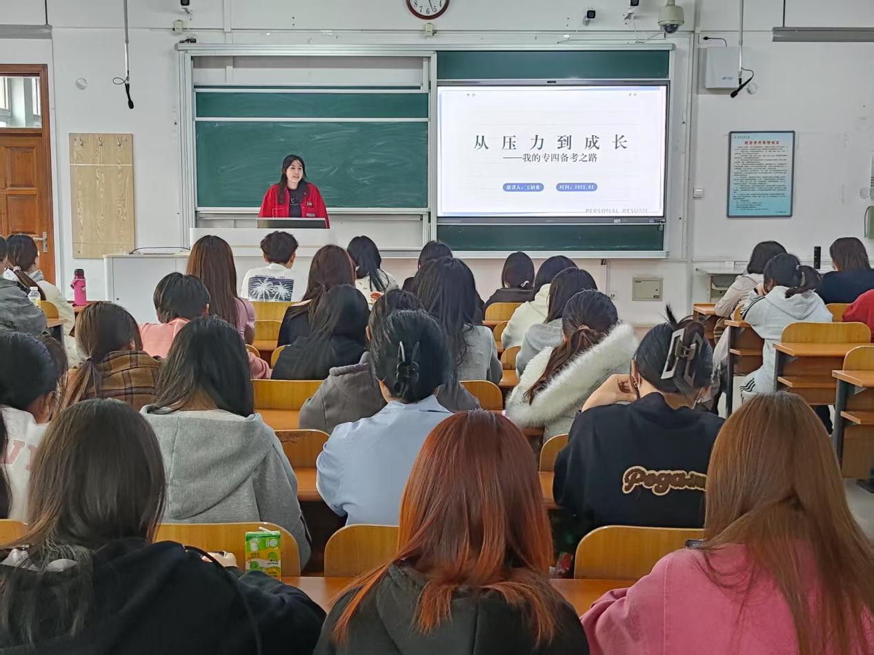 会上,2022级英语专业学生代表王婧希等3名同学分享了他们的备考经验。他们从英语专业四级考试的认知、考试题型及要求、学习资源和备考建议等四个方面进行了深入的介绍和讲解。他们建议学弟学妹们合理利用零散时间,通过“真题+模拟题”的组合训练来提升应试能力,并注重心理调适,以积极的心态迎接未来的考试。接着,英语专业负责人结合多年教学经验,从“考纲解读”“题型分析”“备考策略”三个维度进行了详细指导。她针对听力理解、语言知识、阅读理解和写作四大模块,分别提出了实用建议:听力训练应结合精听与泛听,积累同义替换表达;语法和词汇题要回归基础,通过真题总结高频考点;阅读部分需提升速读和细节定位能力;写作则要强化逻辑框架,避免模板化,注重内容深度。