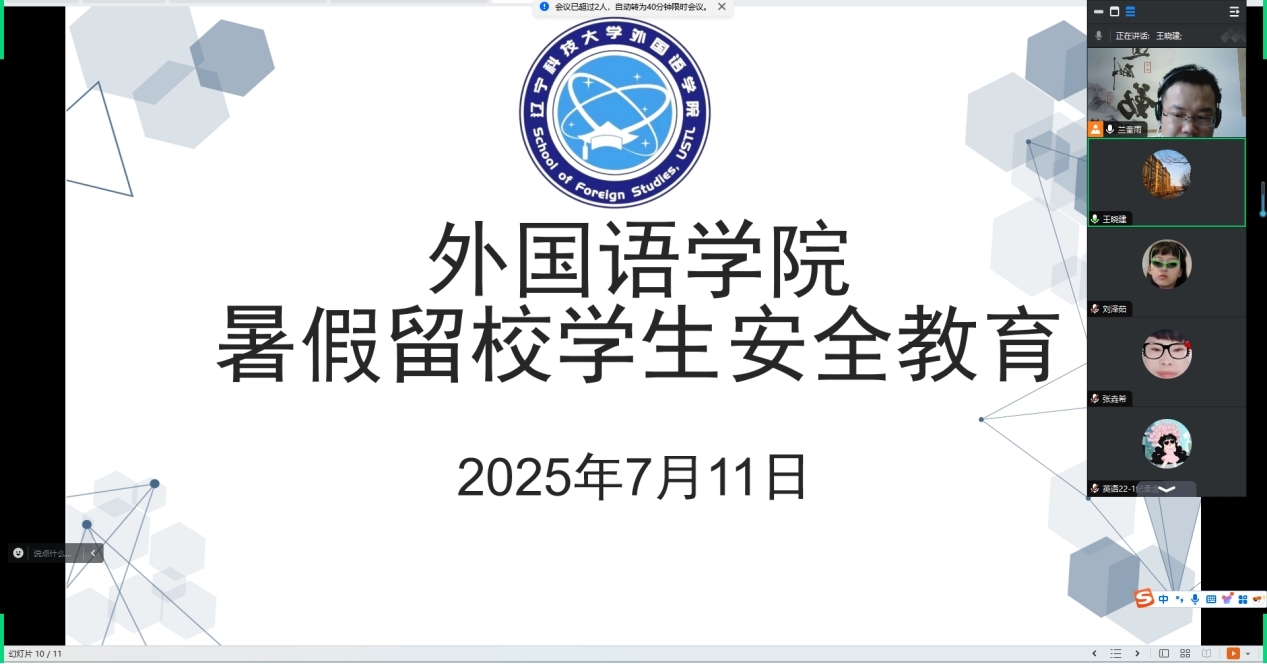7月11日,辽宁科技大学外国语学院在腾讯会议召开暑期留校学生安全教育会。学院学生工作负责人、辅导员及全体留校学生参加会议。