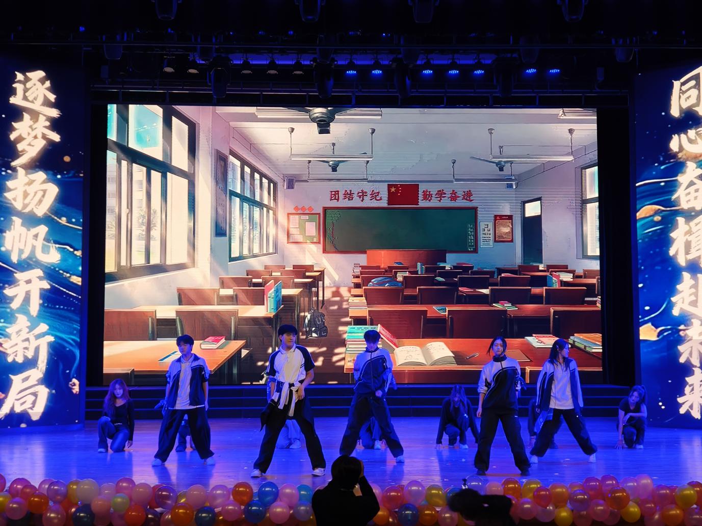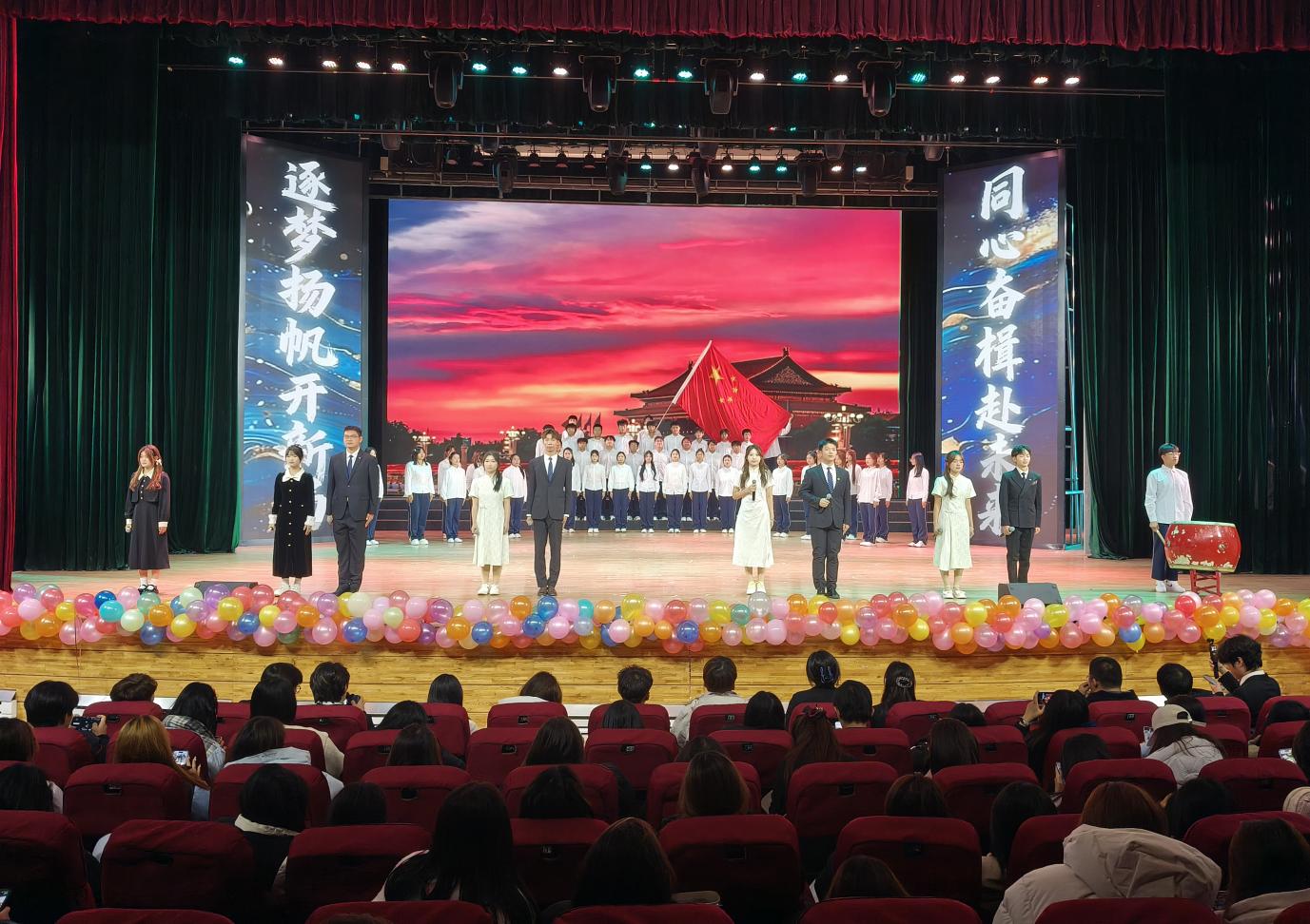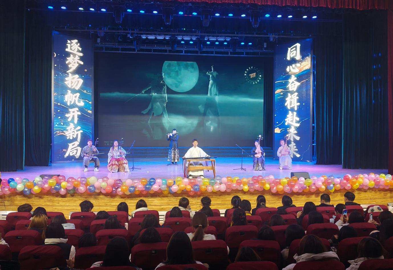 晚会分为“启梦新程·青春序章”“筑梦征程·砥砺歌行”和“绘梦未来·共赴山海”三个篇章,涵盖歌舞、乐器、小品、互动游戏等多元节目。开场歌舞《奔跑的青春》、乐器表演《水龙吟》等轮番登场,接连点燃现场氛围。其中,外语学院学子表现亮眼,廖宇妃在歌曲串烧《我怀念的》中以细腻声线诠释青春情怀;刘博瀚独唱《听海》,凭借极具感染力的演绎赢得全场喝彩;杨俊宇参与朗诵《跨越时代的回响》,以铿锵语调升华晚会立意,充分展现外院学子的艺术风采与青春风貌。