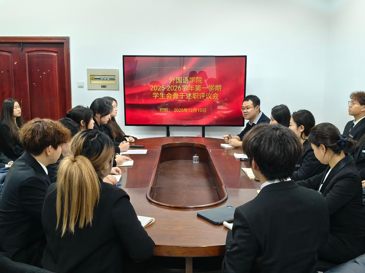 12月10日,辽宁科技大学外国语学院在博识楼A109召开2025-2026学年第一学期学生会骨干述职评议会。学院团工作负责人、各部门负责人和工作人员参会。