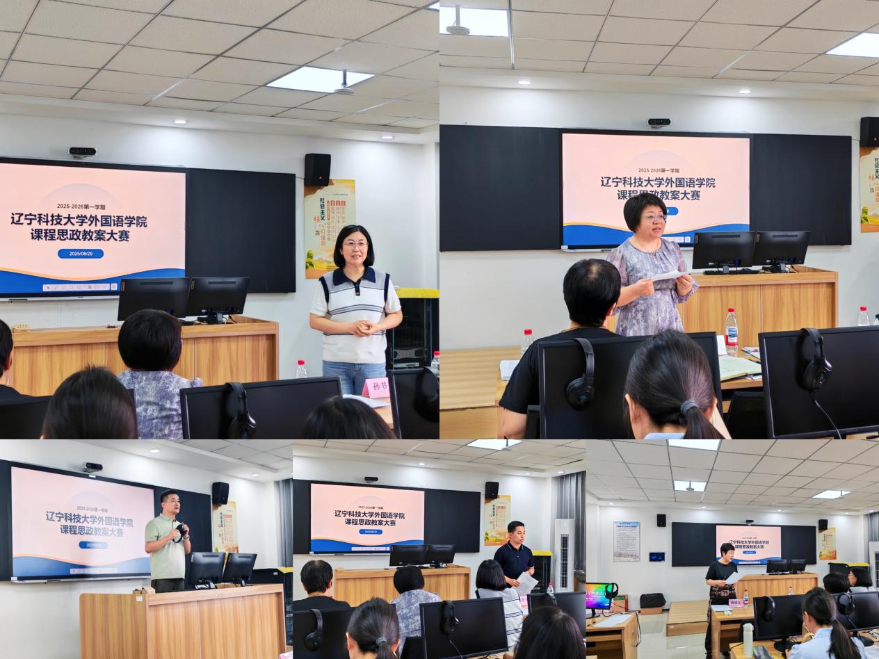 8月29日下午,辽宁科技大学外国语学院在博识楼A513教室举办“课程思政育人才 教案大赛展风采”课程思政教案大赛。特邀教学质量监控与评估李雪处长,校督导陈晓义老师,马克思主义学院孙书平副院长担任评委专家。学院全体教师参与观摩,为教师搭建了“互学互鉴、共同成长”的交流平台。经过激烈角逐,大赛最终评选出一等奖2名、二等奖3名、三等奖5名。其中,一等奖获得者将代表外国语学院参加校级课程思政教案评比,展现学院课程思政建设成果。